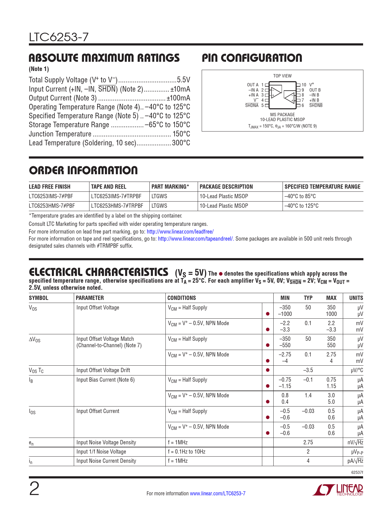 LTC6253IMS-7#PBF LTC6253IMS-7#TRPBF LTGWS 10-Lead Plastic MSOP –40°C to 85°C LTC6253HMS-7#PBF LTC6253HMS-7#TRPBF LTGWS 10-Lead Plastic MSOP –40°C to 125°C *Temperature grades are identified by a label on the shipping container. Consult LTC Marketing for parts specified with wider operating temperature ranges. For more information on lead free part marking, go to: http://www.linear.com/leadfree/ For more information on tape and reel specifications, go to: http://www.linear.com/tapeandreel/. Some packages are available in 500 unit reels through designated sales channels with #TRMPBF suffix.
