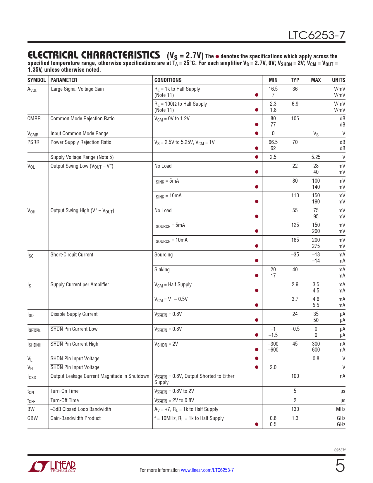 AVOL Large Signal Voltage Gain RL = 1k to Half Supply 16.5 36 V/mV (Note 11) l 7 V/mV RL = 100Ω to Half Supply 2.3 6.9 V/mV (Note 11) l 1.8 V/mV CMRR Common Mode Rejection Ratio VCM = 0V to 1.2V 80 105 dB l 77 dB VCMR Input Common Mode Range l 0 VS V PSRR Power Supply Rejection Ratio VS = 2.5V to 5.25V, VCM = 1V 66.5 70 dB l 62 dB Supply Voltage Range (Note 5) l 2.5 5.25 V VOL Output Swing Low (VOUT – V–) No Load 22 28 mV l 40 mV ISINK = 5mA 80 100 mV l 140 mV ISINK = 10mA 110 150 mV l 190 mV VOH Output Swing High (V+ – VOUT) No Load 55 75 mV l 95 mV ISOURCE = 5mA 125 150 mV l 200 mV ISOURCE = 10mA 165 200 mV l 275 mV ISC Short-Circuit Current Sourcing –35 –18 mA l –14 mA Sinking 20 40 mA l 17 mA IS Supply Current per Amplifier VCM = Half Supply 2.9 3.5 mA l 4.5 mA VCM = V+ – 0.5V 3.7 4.6 mA l 5.5 mA ISD Disable Supply Current VSHDN = 0.8V 24 35 µA l 50 µA ISHDNL SHDN Pin Current Low VSHDN = 0.8V –1 –0.5 0 µA l –1.5 0 µA ISHDNH SHDN Pin Current High VSHDN = 2V –300 45 300 nA l –600 600 nA VL SHDN Pin Input Voltage l 0.8 V VH SHDN Pin Input Voltage l 2.0 V IOSD Output Leakage Current Magnitude in Shutdown VSHDN = 0.8V, Output Shorted to Either 100 nA Supply tON Turn-On Time VSHDN = 0.8V to 2V 5 µs tOFF Turn-Off Time VSHDN = 2V to 0.8V 2 µs BW –3dB Closed Loop Bandwidth AV = +7, RL = 1k to Half Supply 130 MHz GBW Gain-Bandwidth Product f = 10MHz, RL = 1k to Half Supply 0.8 1.3 GHz l 0.5 GHz 62537f For more information www.linear.com/LTC6253-7 5 Document Outline Features Applications Description Typical Application Absolute Maximum Ratings Order Information Electrical Characteristics Pin Functions Applications Information Typical Applications Typical Application Related Parts