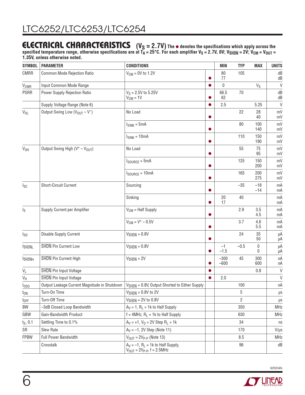 CMRR Common Mode Rejection Ratio VCM = 0V to 1.2V 80 105 dB l 77 dB VCMR Input Common Mode Range l 0 VS V PSRR Power Supply Rejection Ratio VS = 2.5V to 5.25V 66.5 70 dB VCM = 1V l 62 dB Supply Voltage Range (Note 6) l 2.5 5.25 V VOL Output Swing Low (VOUT – V–) No Load 22 28 mV l 40 mV ISINK = 5mA 80 100 mV l 140 mV ISINK = 10mA 110 150 mV l 190 mV VOH Output Swing High (V+ – VOUT) No Load 55 75 mV l 95 mV ISOURCE = 5mA 125 150 mV l 200 mV ISOURCE = 10mA 165 200 mV l 275 mV ISC Short-Circuit Current Sourcing –35 –18 mA l –14 mA Sinking 20 40 mA l 17 mA IS Supply Current per Amplifier VCM = Half Supply 2.9 3.5 mA l 4.5 mA VCM = V+ – 0.5V 3.7 4.6 mA l 5.5 mA ISD Disable Supply Current VSHDN = 0.8V 24 35 µA l 50 µA ISHDNL SHDN Pin Current Low VSHDN = 0.8V –1 –0.5 0 µA l –1.5 0 µA ISHDNH SHDN Pin Current High VSHDN = 2V –300 45 300 nA l –600 600 nA VL SHDN Pin Input Voltage l 0.8 V VH SHDN Pin Input Voltage l 2.0 V IOSD Output Leakage Current Magnitude in Shutdown VSHDN = 0.8V, Output Shorted to Either Supply 100 nA tON Turn-On Time VSHDN = 0.8V to 2V 5 µs tOFF Turn-Off Time VSHDN = 2V to 0.8V 2 µs BW –3dB Closed Loop Bandwidth AV = 1, RL = 1k to Half Supply 350 MHz GBW Gain-Bandwidth Product f = 4MHz, RL = 1k to Half Supply 630 MHz tS, 0.1 Settling Time to 0.1% AV = +1, VO = 2V Step RL = 1k 34 ns SR Slew Rate AV = –1, 2V Step (Note 11) 170 V/µs FPBW Full Power Bandwidth VOUT = 2VP-P (Note 13) 8.5 MHz Crosstalk AV = –1, RL = 1k to Half Supply, 96 dB VOUT = 2VP-P, f = 2.5MHz 625234fc 6 Document Outline Features Applications Description Typical Application Absolute Maximum Ratings Pin Configuration Order Information Electrical Characteristics Typical Performance Characteristics Pin Functions Applications Information Typical Applications Package Description Revision History Typical Application Related Parts