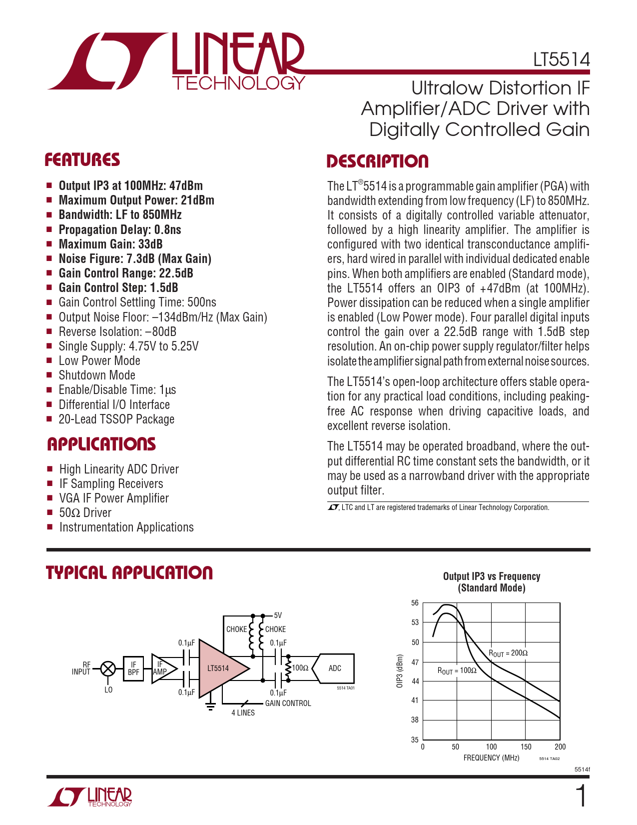 56 5V 53 CHOKE CHOKE 0.1µF 0.1µF 50 ROUT = 200Ω 47 RF IF IF LT5514 100Ω ADC INPUT BPF AMP ROUT = 100Ω 44 OIP3 (dBm) 5514 TA01 LO 0.1µF 0.1µF 41 GAIN CONTROL 4 LINES 38 35 0 50 100 150 200 FREQUENCY (MHz) 5514 TA02 5514f 1