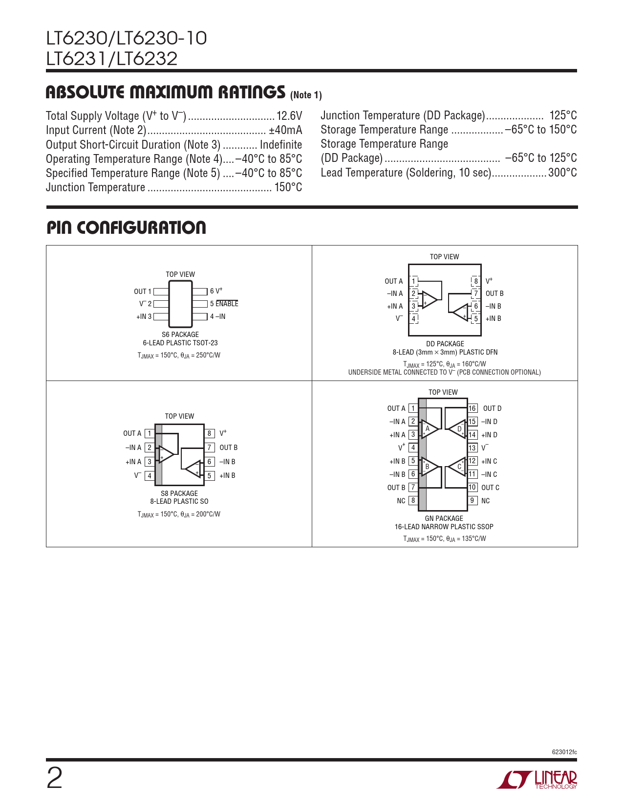 LT6230/LT6230-10 LT6231/LT6232 absoluTe MaxiMuM raTings (Note 1) Total Supply Voltage (V+ to V–) ..12.6V Junction Temperature (DD Package) .. 125°C Input Current (Note 2) ... ±40mA Storage Temperature Range .. –65°C to 150°C Output Short-Circuit Duration (Note 3) .. Indefinite Storage Temperature Range Operating Temperature Range (Note 4)..–40°C to 85°C (DD Package) .. –65°C to 125°C Specified Temperature Range (Note 5) ..–40°C to 85°C Lead Temperature (Soldering, 10 sec) ...300°C Junction Temperature ... 150°C pin conFiguraTion TOP VIEW TOP VIEW OUT A 1 8 V+ OUT 1 6 V+ –IN A 2 – 7 OUT B V– 2 5 ENABLE +IN A 3 + – 6 –IN B +IN 3 4 –IN V– 4 + 5 +IN B S6 PACKAGE 6-LEAD PLASTIC TSOT-23 DD PACKAGE T 8-LEAD (3mm × 3mm) PLASTIC DFN JMAX = 150°C, θJA = 250°C/W TJMAX = 125°C, θJA = 160°C/W UNDERSIDE METAL CONNECTED TO V– (PCB CONNECTION OPTIONAL) TOP VIEW OUT A 1 16 OUT D TOP VIEW –IN A 2 – – 15 –IN D A D OUT A 1 8 V+ +IN A 3 + + 14 +IN D –IN A 2 – 7 OUT B V+ 4 13 V– +IN A 3 + 6 –IN B +IN B 5 + – + 12 +IN C –B C – V– 4 + 5 +IN B –IN B 6 11 –IN C OUT B 7 10 OUT C S8 PACKAGE 8-LEAD PLASTIC SO NC 8 9 NC TJMAX = 150°C, θJA = 200°C/W GN PACKAGE 16-LEAD NARROW PLASTIC SSOP TJMAX = 150°C, θJA = 135°C/W 623012fc 2 Document Outline Features Applications Description Typical Application Absolute Maximum Ratings Pin Configuration Order Information Electrical Characteristics Typical Performance Characteristics Applications Information Typical Applications Package Description Revision History Typical Applications Related Parts