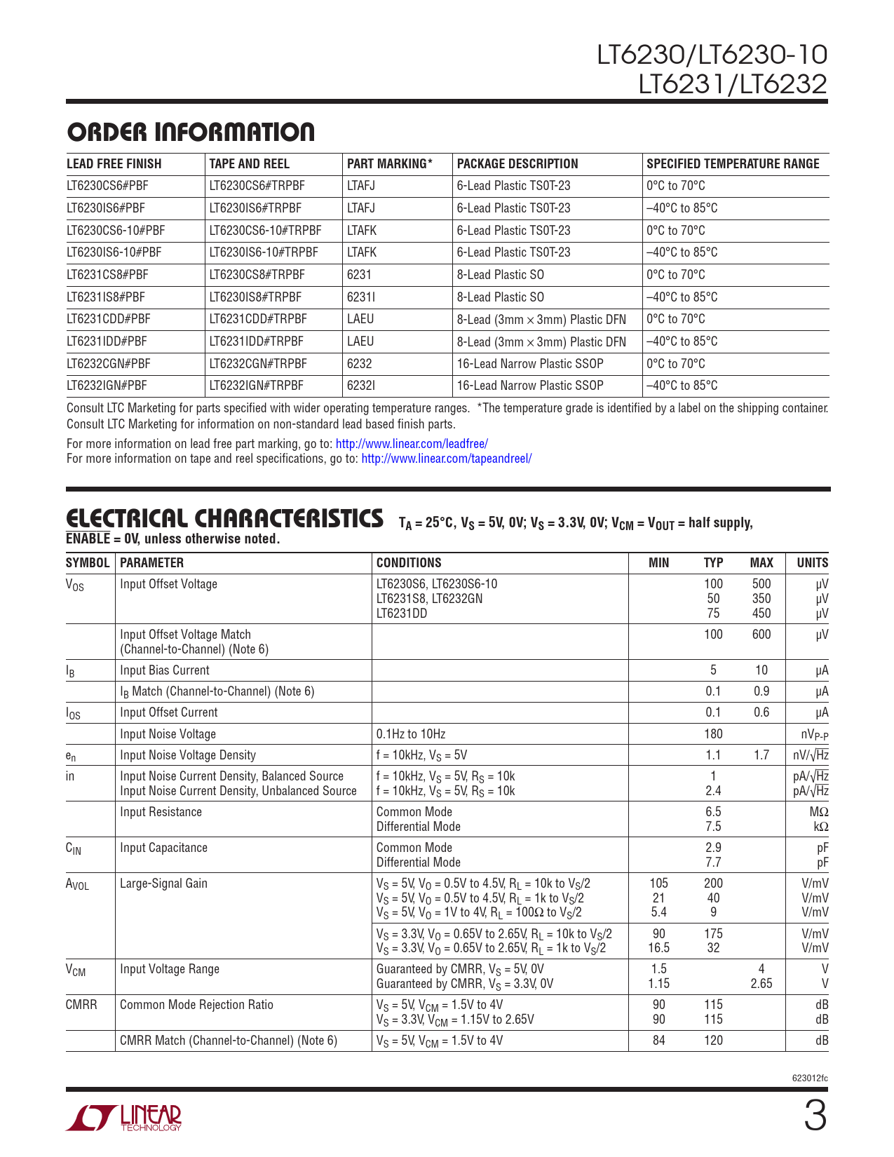LT6230CS6#PBF LT6230CS6#TRPBF LTAFJ 6-Lead Plastic TS0T-23 0°C to 70°C LT6230IS6#PBF LT6230IS6#TRPBF LTAFJ 6-Lead Plastic TS0T-23 –40°C to 85°C LT6230CS6-10#PBF LT6230CS6-10#TRPBF LTAFK 6-Lead Plastic TS0T-23 0°C to 70°C LT6230IS6-10#PBF LT6230IS6-10#TRPBF LTAFK 6-Lead Plastic TS0T-23 –40°C to 85°C LT6231CS8#PBF LT6230CS8#TRPBF 6231 8-Lead Plastic SO 0°C to 70°C LT6231IS8#PBF LT6230IS8#TRPBF 6231I 8-Lead Plastic SO –40°C to 85°C LT6231CDD#PBF LT6231CDD#TRPBF LAEU 8-Lead (3mm × 3mm) Plastic DFN 0°C to 70°C LT6231IDD#PBF LT6231IDD#TRPBF LAEU 8-Lead (3mm × 3mm) Plastic DFN –40°C to 85°C LT6232CGN#PBF LT6232CGN#TRPBF 6232 16-Lead Narrow Plastic SSOP 0°C to 70°C LT6232IGN#PBF LT6232IGN#TRPBF 6232I 16-Lead Narrow Plastic SSOP –40°C to 85°C Consult LTC Marketing for parts specified with wider operating temperature ranges. *The temperature grade is identified by a label on the shipping container. Consult LTC Marketing for information on non-standard lead based finish parts. For more information on lead free part marking, go to: http://www.linear.com/leadfree/ For more information on tape and reel specifications, go to: http://www.linear.com/tapeandreel/