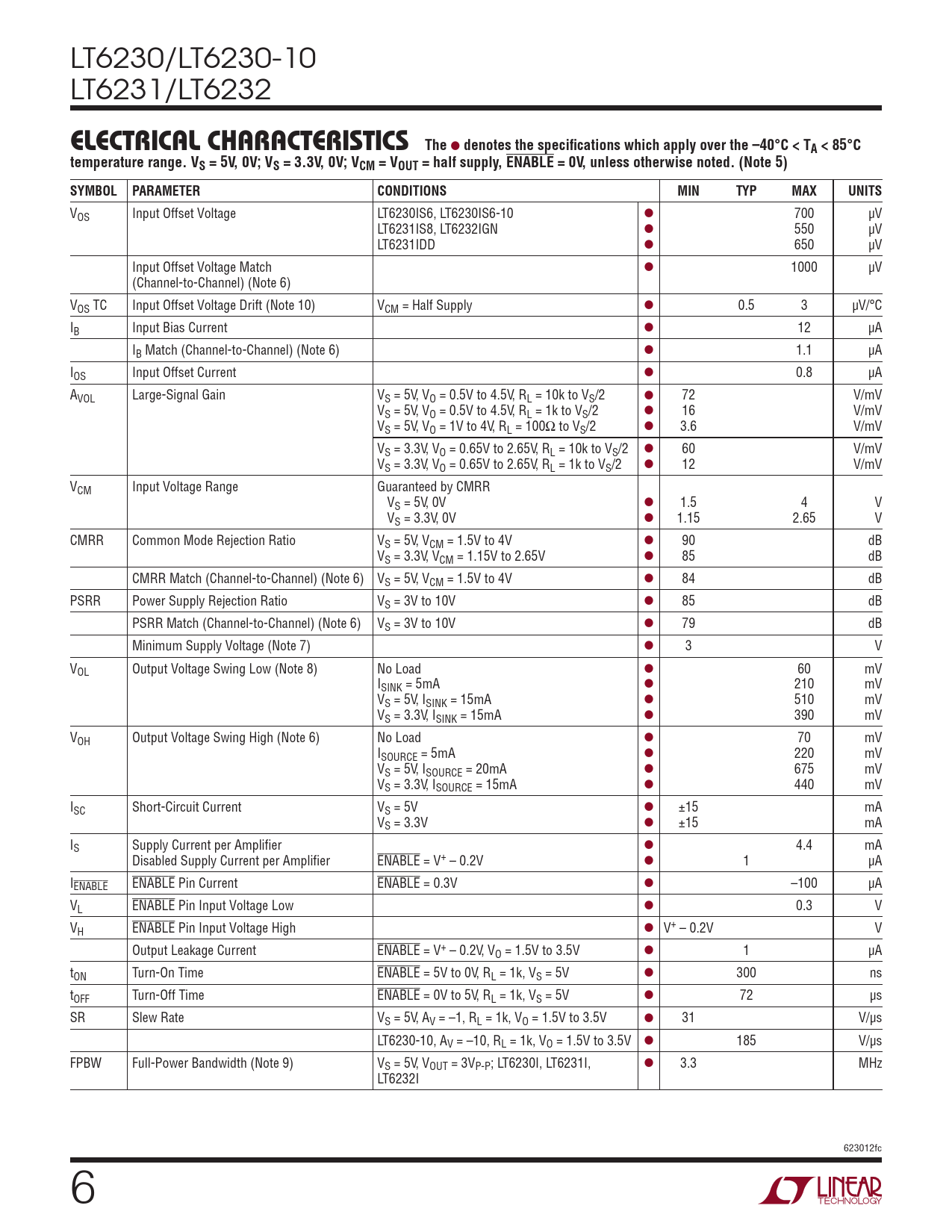 LT6230/LT6230-10 LT6231/LT6232 elecTrical characTerisTicsThe l denotes the specifications which apply over the –40°C < TA < 85°Ctemperature range. VS = 5V, 0V; VS = 3.3V, 0V; VCM = VOUT = half supply, ENABLE = 0V, unless otherwise noted. (Note 5) SYMBOL PARAMETERCONDITIONSMINTYPMAXUNITS VOS Input Offset Voltage LT6230IS6, LT6230IS6-10 l 700 µV LT6231IS8, LT6232IGN l 550 µV LT6231IDD l 650 µV Input Offset Voltage Match l 1000 µV (Channel-to-Channel) (Note 6) VOS TC Input Offset Voltage Drift (Note 10) VCM = Half Supply l 0.5 3 µV/°C IB Input Bias Current l 12 µA IB Match (Channel-to-Channel) (Note 6) l 1.1 µA IOS Input Offset Current l 0.8 µA AVOL Large-Signal Gain VS = 5V, VO = 0.5V to 4.5V, RL = 10k to VS/2 l 72 V/mV VS = 5V, VO = 0.5V to 4.5V, RL = 1k to VS/2 l 16 V/mV VS = 5V, VO = 1V to 4V, RL = 100Ω to VS/2 l 3.6 V/mV VS = 3.3V, VO = 0.65V to 2.65V, RL = 10k to VS/2 l 60 V/mV VS = 3.3V, VO = 0.65V to 2.65V, RL = 1k to VS/2 l 12 V/mV VCM Input Voltage Range Guaranteed by CMRR VS = 5V, 0V l 1.5 4 V VS = 3.3V, 0V l 1.15 2.65 V CMRR Common Mode Rejection Ratio VS = 5V, VCM = 1.5V to 4V l 90 dB VS = 3.3V, VCM = 1.15V to 2.65V l 85 dB CMRR Match (Channel-to-Channel) (Note 6) VS = 5V, VCM = 1.5V to 4V l 84 dB PSRR Power Supply Rejection Ratio VS = 3V to 10V l 85 dB PSRR Match (Channel-to-Channel) (Note 6) VS = 3V to 10V l 79 dB Minimum Supply Voltage (Note 7) l 3 V VOL Output Voltage Swing Low (Note 8) No Load l 60 mV ISINK = 5mA l 210 mV VS = 5V, ISINK = 15mA l 510 mV VS = 3.3V, ISINK = 15mA l 390 mV VOH Output Voltage Swing High (Note 6) No Load l 70 mV ISOURCE = 5mA l 220 mV VS = 5V, ISOURCE = 20mA l 675 mV VS = 3.3V, ISOURCE = 15mA l 440 mV ISC Short-Circuit Current VS = 5V l ±15 mA VS = 3.3V l ±15 mA IS Supply Current per Amplifier l 4.4 mA Disabled Supply Current per Amplifier ENABLE = V+ – 0.2V l 1 µA IENABLE ENABLE Pin Current ENABLE = 0.3V l –100 µA VL ENABLE Pin Input Voltage Low l 0.3 V VH ENABLE Pin Input Voltage High l V+ – 0.2V V Output Leakage Current ENABLE = V+ – 0.2V, VO = 1.5V to 3.5V l 1 µA tON Turn-On Time ENABLE = 5V to 0V, RL = 1k, VS = 5V l 300 ns tOFF Turn-Off Time ENABLE = 0V to 5V, RL = 1k, VS = 5V l 72 µs SR Slew Rate VS = 5V, AV = –1, RL = 1k, VO = 1.5V to 3.5V l 31 V/µs LT6230-10, AV = –10, RL = 1k, VO = 1.5V to 3.5V l 185 V/µs FPBW Full-Power Bandwidth (Note 9) VS = 5V, VOUT = 3VP-P; LT6230I, LT6231I, l 3.3 MHz LT6232I 623012fc 6 Document Outline Features Applications Description Typical Application Absolute Maximum Ratings Pin Configuration Order Information Electrical Characteristics Typical Performance Characteristics Applications Information Typical Applications Package Description Revision History Typical Applications Related Parts