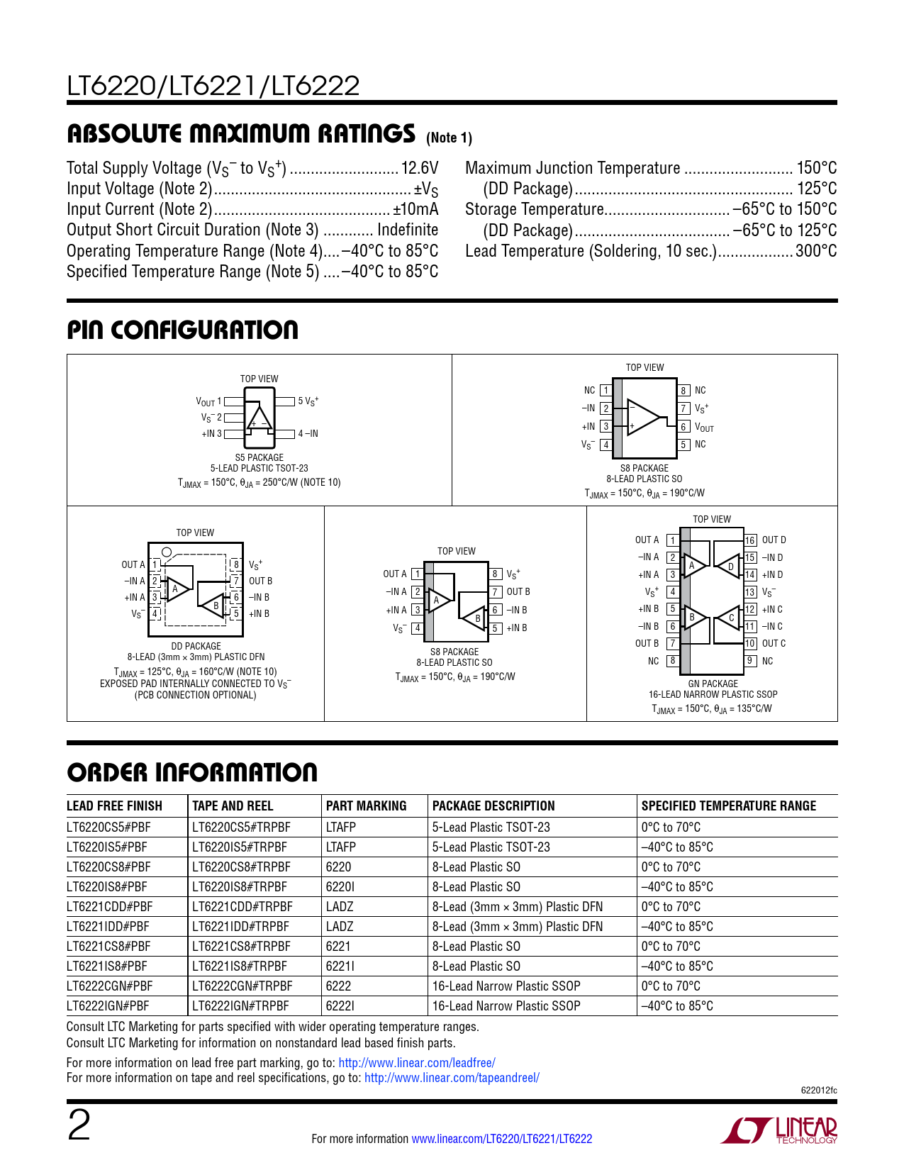 LT6220CS5#PBF LT6220CS5#TRPBF LTAFP 5-Lead Plastic TSOT-23 0°C to 70°C LT6220IS5#PBF LT6220IS5#TRPBF LTAFP 5-Lead Plastic TSOT-23 –40°C to 85°C LT6220CS8#PBF LT6220CS8#TRPBF 6220 8-Lead Plastic SO 0°C to 70°C LT6220IS8#PBF LT6220IS8#TRPBF 6220I 8-Lead Plastic SO –40°C to 85°C LT6221CDD#PBF LT6221CDD#TRPBF LADZ 8-Lead (3mm × 3mm) Plastic DFN 0°C to 70°C LT6221IDD#PBF LT6221IDD#TRPBF LADZ 8-Lead (3mm × 3mm) Plastic DFN –40°C to 85°C LT6221CS8#PBF LT6221CS8#TRPBF 6221 8-Lead Plastic SO 0°C to 70°C LT6221IS8#PBF LT6221IS8#TRPBF 6221I 8-Lead Plastic SO –40°C to 85°C LT6222CGN#PBF LT6222CGN#TRPBF 6222 16-Lead Narrow Plastic SSOP 0°C to 70°C LT6222IGN#PBF LT6222IGN#TRPBF 6222I 16-Lead Narrow Plastic SSOP –40°C to 85°C Consult LTC Marketing for parts specified with wider operating temperature ranges. Consult LTC Marketing for information on nonstandard lead based finish parts. For more information on lead free part marking, go to: http://www.linear.com/leadfree/ For more information on tape and reel specifications, go to: http://www.linear.com/tapeandreel/ 622012fc 2 For more information www.linear.com/LT6220/LT6221/LT6222 Document Outline Features Applications Typical Application Description Absolute Maximum Ratings Pin Configuration Order Information Electrical Characteristics Typical Performance Characteristics Applications Information Typical Applications Package Description Revision History Typical Application Related Parts