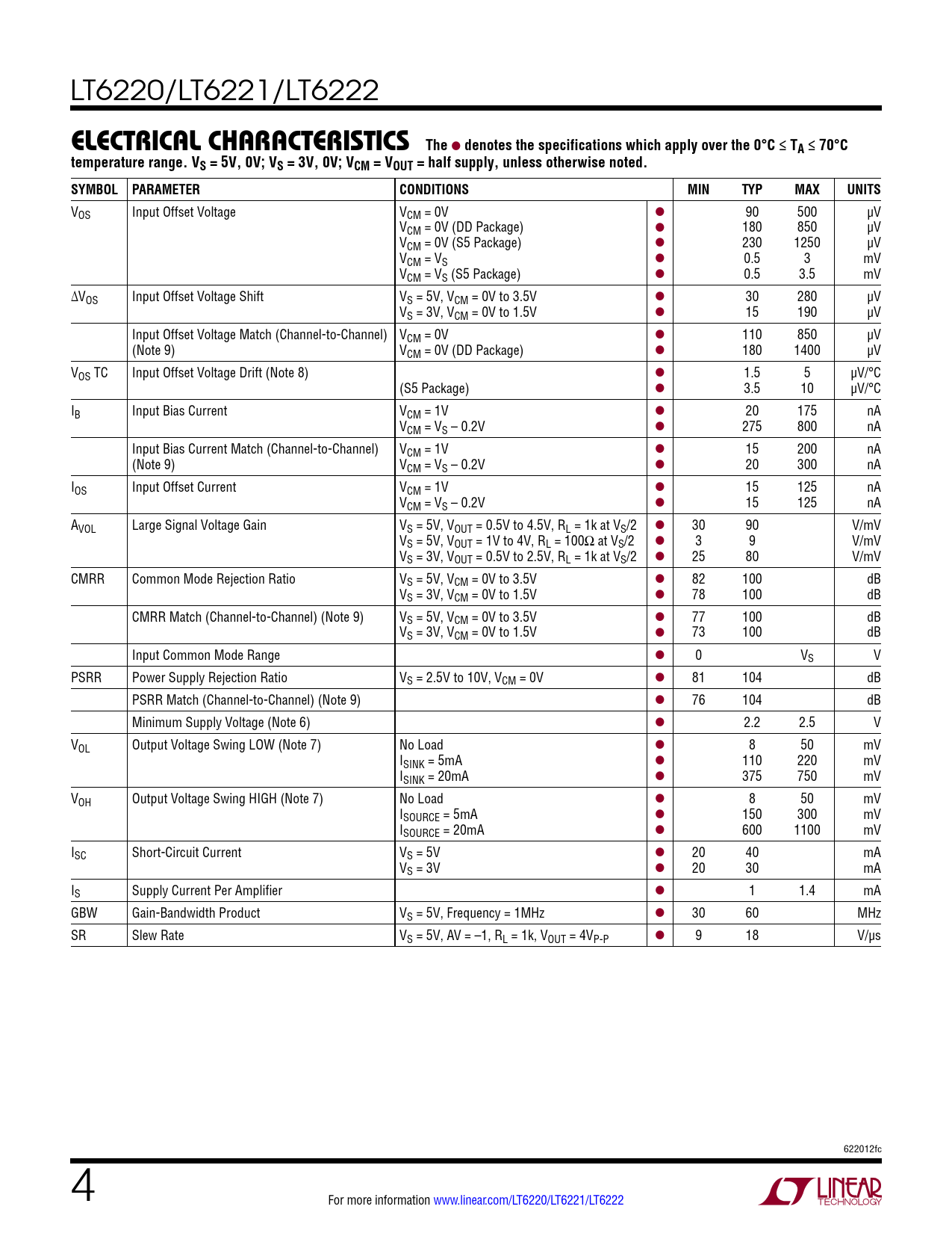 VOS Input Offset Voltage VCM = 0V l 90 500 µV VCM = 0V (DD Package) l 180 850 µV VCM = 0V (S5 Package) l 230 1250 µV VCM = VS l 0.5 3 mV VCM = VS (S5 Package) l 0.5 3.5 mV ∆VOS Input Offset Voltage Shift VS = 5V, VCM = 0V to 3.5V l 30 280 µV VS = 3V, VCM = 0V to 1.5V l 15 190 µV Input Offset Voltage Match (Channel-to-Channel) VCM = 0V l 110 850 µV (Note 9) VCM = 0V (DD Package) l 180 1400 µV VOS TC Input Offset Voltage Drift (Note 8) l 1.5 5 µV/°C (S5 Package) l 3.5 10 µV/°C IB Input Bias Current VCM = 1V l 20 175 nA VCM = VS – 0.2V l 275 800 nA Input Bias Current Match (Channel-to-Channel) VCM = 1V l 15 200 nA (Note 9) VCM = VS – 0.2V l 20 300 nA IOS Input Offset Current VCM = 1V l 15 125 nA VCM = VS – 0.2V l 15 125 nA AVOL Large Signal Voltage Gain VS = 5V, VOUT = 0.5V to 4.5V, RL = 1k at VS/2 l 30 90 V/mV VS = 5V, VOUT = 1V to 4V, RL = 100Ω at VS/2 l 3 9 V/mV VS = 3V, VOUT = 0.5V to 2.5V, RL = 1k at VS/2 l 25 80 V/mV CMRR Common Mode Rejection Ratio VS = 5V, VCM = 0V to 3.5V l 82 100 dB VS = 3V, VCM = 0V to 1.5V l 78 100 dB CMRR Match (Channel-to-Channel) (Note 9) VS = 5V, VCM = 0V to 3.5V l 77 100 dB VS = 3V, VCM = 0V to 1.5V l 73 100 dB Input Common Mode Range l 0 VS V PSRR Power Supply Rejection Ratio VS = 2.5V to 10V, VCM = 0V l 81 104 dB PSRR Match (Channel-to-Channel) (Note 9) l 76 104 dB Minimum Supply Voltage (Note 6) l 2.2 2.5 V VOL Output Voltage Swing LOW (Note 7) No Load l 8 50 mV ISINK = 5mA l 110 220 mV ISINK = 20mA l 375 750 mV VOH Output Voltage Swing HIGH (Note 7) No Load l 8 50 mV ISOURCE = 5mA l 150 300 mV ISOURCE = 20mA l 600 1100 mV ISC Short-Circuit Current VS = 5V l 20 40 mA VS = 3V l 20 30 mA IS Supply Current Per Amplifier l 1 1.4 mA GBW Gain-Bandwidth Product VS = 5V, Frequency = 1MHz l 30 60 MHz SR Slew Rate VS = 5V, AV = –1, RL = 1k, VOUT = 4VP-P l 9 18 V/µs 622012fc 4 For more information www.linear.com/LT6220/LT6221/LT6222 Document Outline Features Applications Typical Application Description Absolute Maximum Ratings Pin Configuration Order Information Electrical Characteristics Typical Performance Characteristics Applications Information Typical Applications Package Description Revision History Typical Application Related Parts