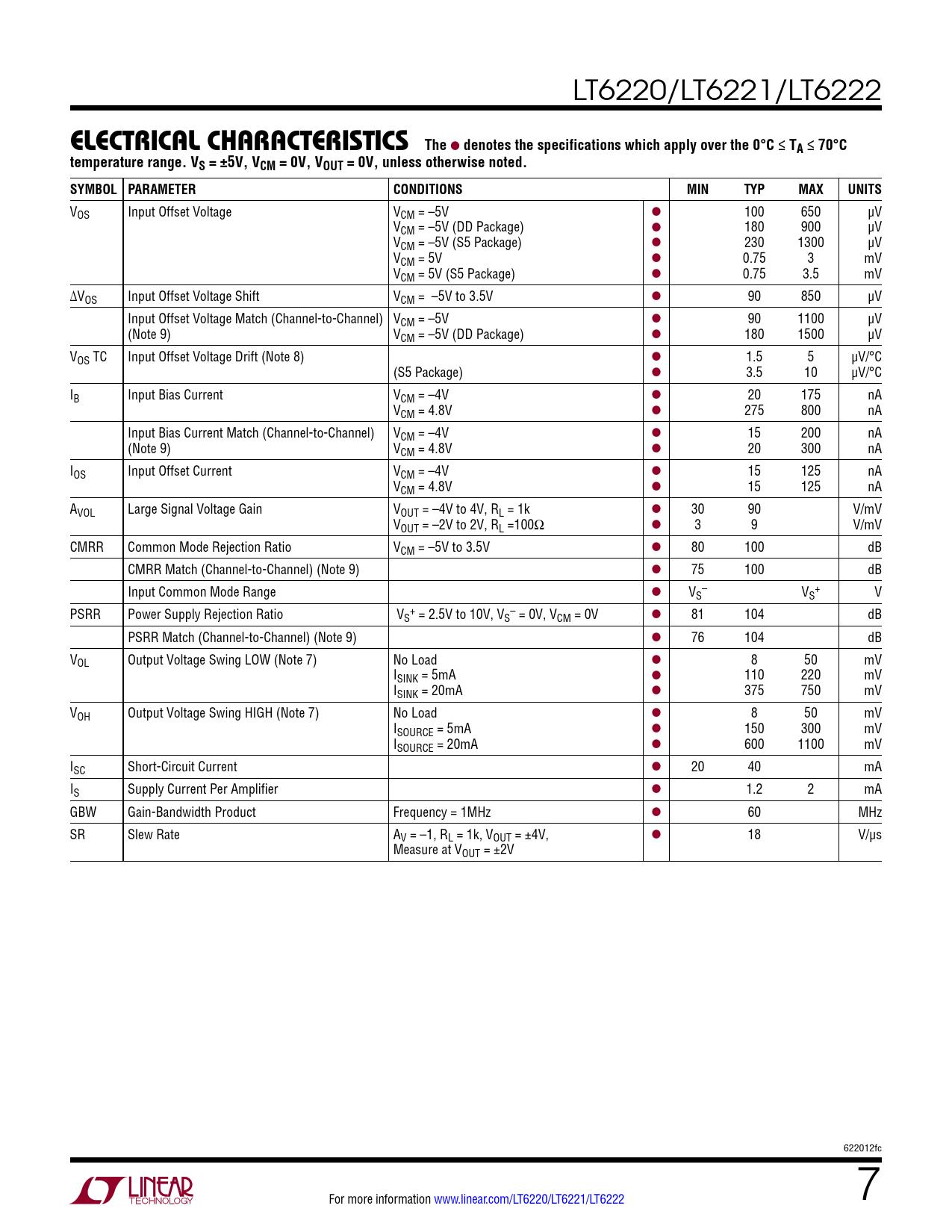 VOS Input Offset Voltage VCM = –5V l 100 650 µV VCM = –5V (DD Package) l 180 900 µV VCM = –5V (S5 Package) l 230 1300 µV VCM = 5V l 0.75 3 mV VCM = 5V (S5 Package) l 0.75 3.5 mV ∆VOS Input Offset Voltage Shift VCM = –5V to 3.5V l 90 850 µV Input Offset Voltage Match (Channel-to-Channel) VCM = –5V l 90 1100 µV (Note 9) VCM = –5V (DD Package) l 180 1500 µV VOS TC Input Offset Voltage Drift (Note 8) l 1.5 5 µV/°C (S5 Package) l 3.5 10 µV/°C IB Input Bias Current VCM = –4V l 20 175 nA VCM = 4.8V l 275 800 nA Input Bias Current Match (Channel-to-Channel) VCM = –4V l 15 200 nA (Note 9) VCM = 4.8V l 20 300 nA IOS Input Offset Current VCM = –4V l 15 125 nA VCM = 4.8V l 15 125 nA AVOL Large Signal Voltage Gain VOUT = –4V to 4V, RL = 1k l 30 90 V/mV VOUT = –2V to 2V, RL =100Ω l 3 9 V/mV CMRR Common Mode Rejection Ratio VCM = –5V to 3.5V l 80 100 dB CMRR Match (Channel-to-Channel) (Note 9) l 75 100 dB Input Common Mode Range l V – + S VS V PSRR Power Supply Rejection Ratio V + – S = 2.5V to 10V, VS = 0V, VCM = 0V l 81 104 dB PSRR Match (Channel-to-Channel) (Note 9) l 76 104 dB VOL Output Voltage Swing LOW (Note 7) No Load l 8 50 mV ISINK = 5mA l 110 220 mV ISINK = 20mA l 375 750 mV VOH Output Voltage Swing HIGH (Note 7) No Load l 8 50 mV ISOURCE = 5mA l 150 300 mV ISOURCE = 20mA l 600 1100 mV ISC Short-Circuit Current l 20 40 mA IS Supply Current Per Amplifier l 1.2 2 mA GBW Gain-Bandwidth Product Frequency = 1MHz l 60 MHz SR Slew Rate AV = –1, RL = 1k, VOUT = ±4V, l 18 V/µs Measure at VOUT = ±2V 622012fc For more information www.linear.com/LT6220/LT6221/LT6222 7 Document Outline Features Applications Typical Application Description Absolute Maximum Ratings Pin Configuration Order Information Electrical Characteristics Typical Performance Characteristics Applications Information Typical Applications Package Description Revision History Typical Application Related Parts