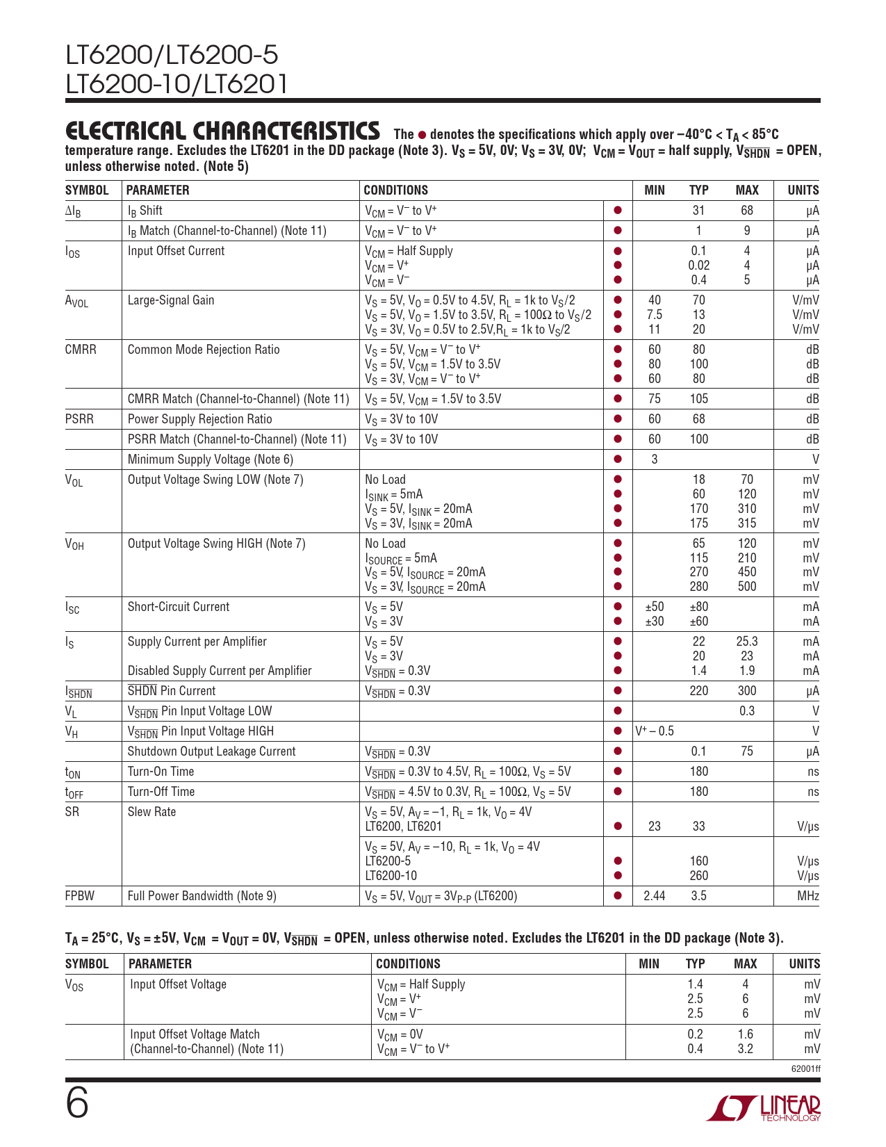LT6200/LT6200-5 LT6200-10/LT6201 elecTrical characTerisTicsThe ● denotes the specifications which apply over –40°C < TA < 85°Ctemperature range. Excludes the LT6201 in the DD package (Note 3). VS = 5V, 0V; VS = 3V, 0V; VCM = VOUT = half supply, VSHDN = OPEN,unless otherwise noted. (Note 5) SYMBOLPARAMETERCONDITIONSMINTYPMAXUNITS ∆IB IB Shift VCM = V– to V+ l 31 68 µA IB Match (Channel-to-Channel) (Note 11) VCM = V– to V+ l 1 9 µA IOS Input Offset Current VCM = Half Supply l 0.1 4 µA VCM = V+ l 0.02 4 µA VCM = V– l 0.4 5 µA AVOL Large-Signal Gain VS = 5V, VO = 0.5V to 4.5V, RL = 1k to VS/2 l 40 70 V/mV VS = 5V, VO = 1.5V to 3.5V, RL = 100Ω to VS/2 l 7.5 13 V/mV VS = 3V, VO = 0.5V to 2.5V,RL = 1k to VS/2 l 11 20 V/mV CMRR Common Mode Rejection Ratio VS = 5V, VCM = V– to V+ l 60 80 dB VS = 5V, VCM = 1.5V to 3.5V l 80 100 dB VS = 3V, VCM = V– to V+ l 60 80 dB CMRR Match (Channel-to-Channel) (Note 11) VS = 5V, VCM = 1.5V to 3.5V l 75 105 dB PSRR Power Supply Rejection Ratio VS = 3V to 10V l 60 68 dB PSRR Match (Channel-to-Channel) (Note 11) VS = 3V to 10V l 60 100 dB Minimum Supply Voltage (Note 6) l 3 V VOL Output Voltage Swing LOW (Note 7) No Load l 18 70 mV ISINK = 5mA l 60 120 mV VS = 5V, ISINK = 20mA l 170 310 mV VS = 3V, ISINK = 20mA l 175 315 mV VOH Output Voltage Swing HIGH (Note 7) No Load l 65 120 mV ISOURCE = 5mA l 115 210 mV VS = 5V, ISOURCE = 20mA l 270 450 mV VS = 3V, ISOURCE = 20mA l 280 500 mV ISC Short-Circuit Current VS = 5V l ±50 ±80 mA VS = 3V l ±30 ±60 mA IS Supply Current per Amplifier VS = 5V l 22 25.3 mA VS = 3V l 20 23 mA Disabled Supply Current per Amplifier VSHDN = 0.3V l 1.4 1.9 mA ISHDN SHDN Pin Current VSHDN = 0.3V l 220 300 µA VL VSHDN Pin Input Voltage LOW l 0.3 V VH VSHDN Pin Input Voltage HIGH l V+ – 0.5 V Shutdown Output Leakage Current VSHDN = 0.3V l 0.1 75 µA tON Turn-On Time VSHDN = 0.3V to 4.5V, RL = 100Ω, VS = 5V l 180 ns tOFF Turn-Off Time VSHDN = 4.5V to 0.3V, RL = 100Ω, VS = 5V l 180 ns SR Slew Rate VS = 5V, AV = –1, RL = 1k, VO = 4V LT6200, LT6201 l 23 33 V/µs VS = 5V, AV = –10, RL = 1k, VO = 4V LT6200-5 l 160 V/µs LT6200-10 l 260 V/µs FPBW Full Power Bandwidth (Note 9) VS = 5V, VOUT = 3VP-P (LT6200) l 2.44 3.5 MHz TA = 25°C, VS = ±5V, VCM = VOUT = 0V, VSHDN = OPEN, unless otherwise noted. Excludes the LT6201 in the DD package (Note 3). SYMBOLPARAMETERCONDITIONSMINTYPMAXUNITS VOS Input Offset Voltage VCM = Half Supply 1.4 4 mV VCM = V+ 2.5 6 mV VCM = V– 2.5 6 mV Input Offset Voltage Match VCM = 0V 0.2 1.6 mV (Channel-to-Channel) (Note 11) VCM = V– to V+ 0.4 3.2 mV 62001ff 6 Document Outline Features Applications Description Typical Application Absolute Maximum Ratings Pin Configuration Order Information Electrical Characteristics Typical Performance Characteristics Applications Information Package Description Revision History Typical Application Related Parts