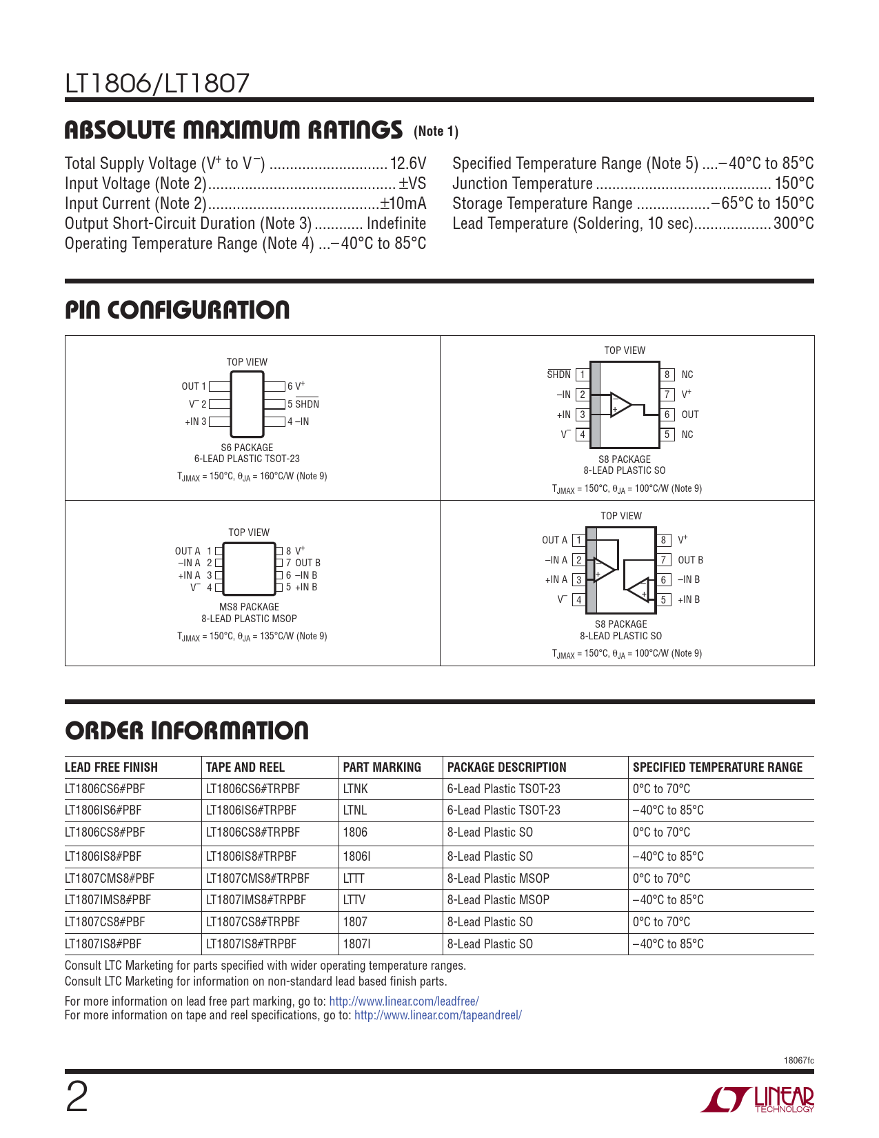 LT1806CS6#PBF LT1806CS6#TRPBF LTNK 6-Lead Plastic TSOT-23 0°C to 70°C LT1806IS6#PBF LT1806IS6#TRPBF LTNL 6-Lead Plastic TSOT-23 –40°C to 85°C LT1806CS8#PBF LT1806CS8#TRPBF 1806 8-Lead Plastic SO 0°C to 70°C LT1806IS8#PBF LT1806IS8#TRPBF 1806I 8-Lead Plastic SO –40°C to 85°C LT1807CMS8#PBF LT1807CMS8#TRPBF LTTT 8-Lead Plastic MSOP 0°C to 70°C LT1807IMS8#PBF LT1807IMS8#TRPBF LTTV 8-Lead Plastic MSOP –40°C to 85°C LT1807CS8#PBF LT1807CS8#TRPBF 1807 8-Lead Plastic SO 0°C to 70°C LT1807IS8#PBF LT1807IS8#TRPBF 1807I 8-Lead Plastic SO –40°C to 85°C Consult LTC Marketing for parts specifi ed with wider operating temperature ranges. Consult LTC Marketing for information on non-standard lead based fi nish parts. For more information on lead free part marking, go to: http://www.linear.com/leadfree/ For more information on tape and reel specifi cations, go to: http://www.linear.com/tapeandreel/ 18067fc 2