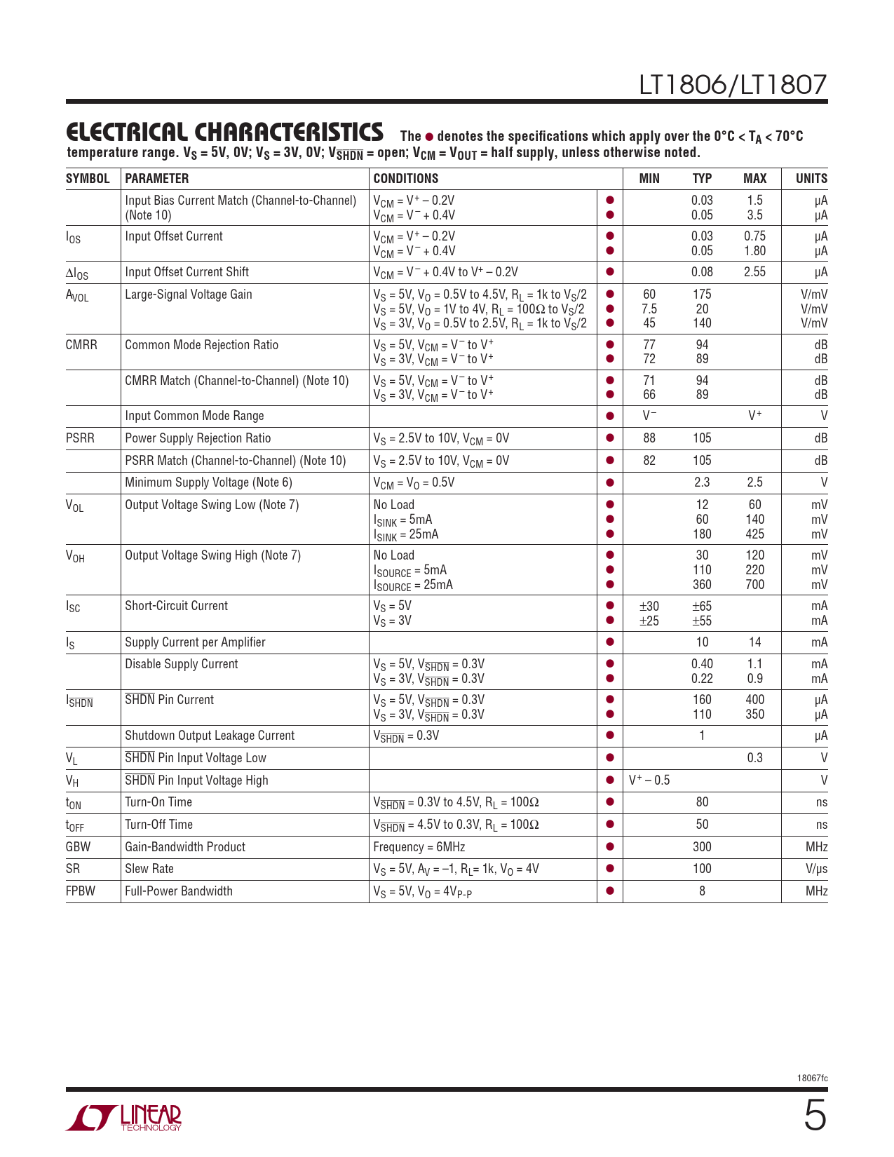 Input Bias Current Match (Channel-to-Channel) VCM = V+ – 0.2V l 0.03 1.5 μA (Note 10) VCM = V – + 0.4V l 0.05 3.5 μA IOS Input Offset Current VCM = V+ – 0.2V l 0.03 0.75 μA VCM = V – + 0.4V l 0.05 1.80 μA ΔIOS Input Offset Current Shift VCM = V – + 0.4V to V+ – 0.2V l 0.08 2.55 μA AVOL Large-Signal Voltage Gain VS = 5V, VO = 0.5V to 4.5V, RL = 1k to VS/2 l 60 175 V/mV VS = 5V, VO = 1V to 4V, RL = 100Ω to VS/2 l 7.5 20 V/mV VS = 3V, VO = 0.5V to 2.5V, RL = 1k to VS/2 l 45 140 V/mV CMRR Common Mode Rejection Ratio VS = 5V, VCM = V – to V+ l 77 94 dB VS = 3V, VCM = V – to V+ l 72 89 dB CMRR Match (Channel-to-Channel) (Note 10) VS = 5V, VCM = V – to V+ l 71 94 dB VS = 3V, VCM = V – to V+ l 66 89 dB Input Common Mode Range l V – V+ V PSRR Power Supply Rejection Ratio VS = 2.5V to 10V, VCM = 0V l 88 105 dB PSRR Match (Channel-to-Channel) (Note 10) VS = 2.5V to 10V, VCM = 0V l 82 105 dB Minimum Supply Voltage (Note 6) VCM = VO = 0.5V l 2.3 2.5 V VOL Output Voltage Swing Low (Note 7) No Load l 12 60 mV ISINK = 5mA l 60 140 mV ISINK = 25mA l 180 425 mV VOH Output Voltage Swing High (Note 7) No Load l 30 120 mV ISOURCE = 5mA l 110 220 mV ISOURCE = 25mA l 360 700 mV ISC Short-Circuit Current VS = 5V l ±30 ±65 mA VS = 3V l ±25 ±55 mA IS Supply Current per Amplifi er l 10 14 mA Disable Supply Current VS = 5V, VSHDN = 0.3V l 0.40 1.1 mA VS = 3V, VSHDN = 0.3V l 0.22 0.9 mA ISHDN SHDN Pin Current VS = 5V, VSHDN = 0.3V l 160 400 μA VS = 3V, VSHDN = 0.3V l 110 350 μA Shutdown Output Leakage Current VSHDN = 0.3V l 1 μA VL SHDN Pin Input Voltage Low l 0.3 V VH SHDN Pin Input Voltage High l V+ – 0.5 V tON Turn-On Time VSHDN = 0.3V to 4.5V, RL = 100Ω l 80 ns tOFF Turn-Off Time VSHDN = 4.5V to 0.3V, RL = 100Ω l 50 ns GBW Gain-Bandwidth Product Frequency = 6MHz l 300 MHz SR Slew Rate VS = 5V, AV = –1, RL= 1k, VO = 4V l 100 V/μs FPBW Full-Power Bandwidth VS = 5V, VO = 4VP-P l 8 MHz 18067fc 5