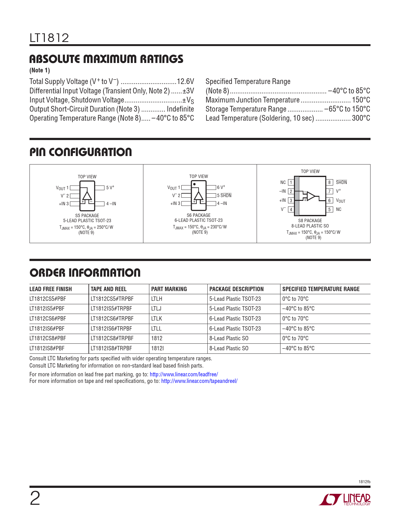 LT1812CS5#PBF LT1812CS5#TRPBF LTLH 5-Lead Plastic TSOT-23 0°C to 70°C LT1812IS5#PBF LT1812IS5#TRPBF LTLJ 5-Lead Plastic TSOT-23 –40°C to 85°C LT1812CS6#PBF LT1812CS6#TRPBF LTLK 6-Lead Plastic TSOT-23 0°C to 70°C LT1812IS6#PBF LT1812IS6#TRPBF LTLL 6-Lead Plastic TSOT-23 –40°C to 85°C LT1812CS8#PBF LT1812CS8#TRPBF 1812 8-Lead Plastic SO 0°C to 70°C LT1812IS8#PBF LT1812IS8#TRPBF 1812I 8-Lead Plastic SO –40°C to 85°C Consult LTC Marketing for parts specifi ed with wider operating temperature ranges. Consult LTC Marketing for information on non-standard lead based fi nish parts. For more information on lead free part marking, go to: http://www.linear.com/leadfree/ For more information on tape and reel specifi cations, go to: http://www.linear.com/tapeandreel/ 1812fb 2