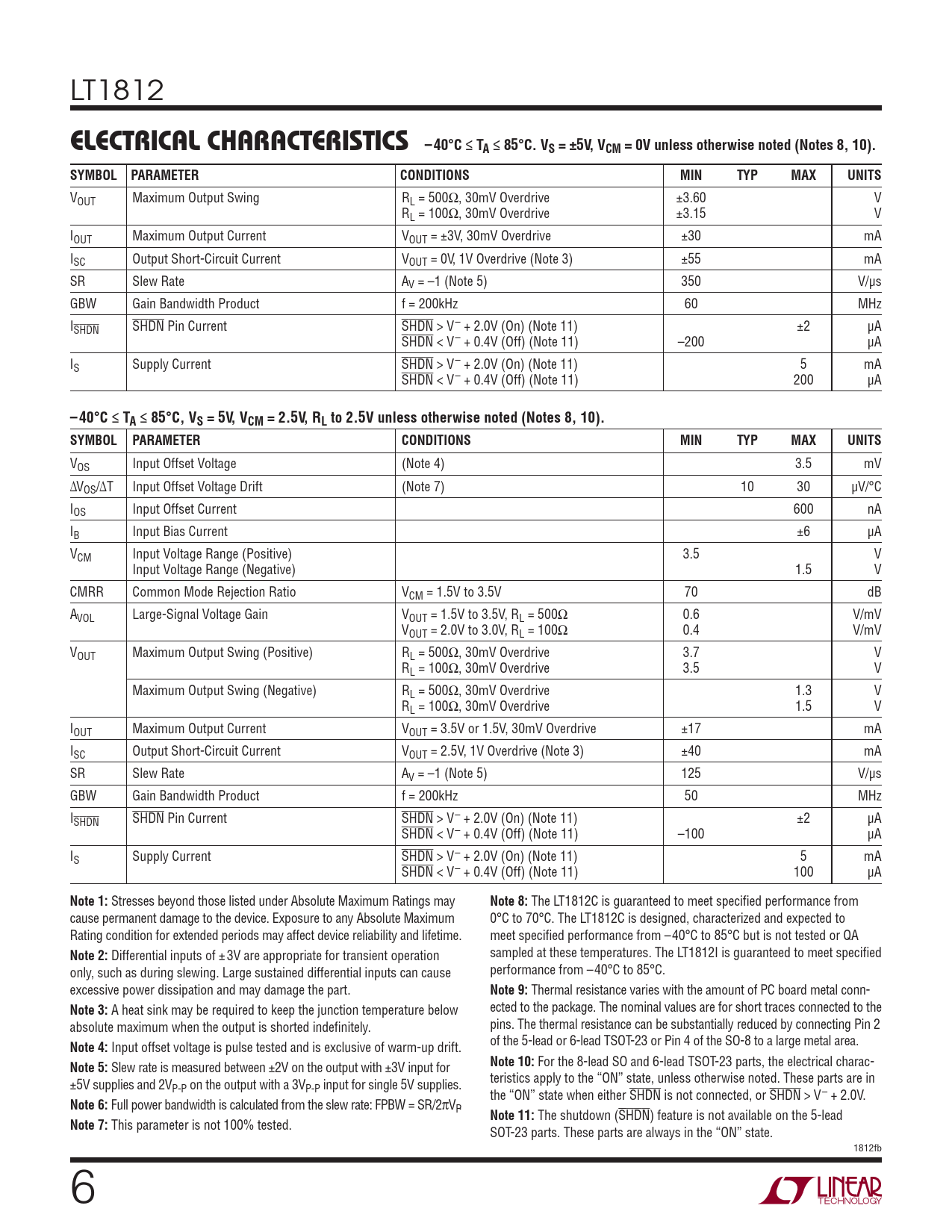 LT1812 ELECTRICAL CHARACTERISTICS– 40°C ≤ TA ≤ 85°C. VS = ±5V, VCM = 0V unless otherwise noted (Notes 8, 10).SYMBOLPARAMETERCONDITIONSMINTYPMAXUNITS VOUT Maximum Output Swing RL = 500Ω, 30mV Overdrive ±3.60 V RL = 100Ω, 30mV Overdrive ±3.15 V IOUT Maximum Output Current VOUT = ±3V, 30mV Overdrive ±30 mA ISC Output Short-Circuit Current VOUT = 0V, 1V Overdrive (Note 3) ±55 mA SR Slew Rate AV = –1 (Note 5) 350 V/μs GBW Gain Bandwidth Product f = 200kHz 60 MHz ISHDN SHDN Pin Current SHDN > V– + 2.0V (On) (Note 11) ±2 μA SHDN < V– + 0.4V (Off) (Note 11) –200 μA IS Supply Current SHDN > V– + 2.0V (On) (Note 11) 5 mA SHDN < V– + 0.4V (Off) (Note 11) 200 μA – 40°C ≤ TA ≤ 85°C, VS = 5V, VCM = 2.5V, RL to 2.5V unless otherwise noted (Notes 8, 10). SYMBOLPARAMETERCONDITIONSMINTYPMAXUNITS VOS Input Offset Voltage (Note 4) 3.5 mV ΔVOS/ΔT Input Offset Voltage Drift (Note 7) 10 30 μV/°C IOS Input Offset Current 600 nA IB Input Bias Current ±6 μA VCM Input Voltage Range (Positive) 3.5 V Input Voltage Range (Negative) 1.5 V CMRR Common Mode Rejection Ratio VCM = 1.5V to 3.5V 70 dB AVOL Large-Signal Voltage Gain VOUT = 1.5V to 3.5V, RL = 500Ω 0.6 V/mV VOUT = 2.0V to 3.0V, RL = 100Ω 0.4 V/mV VOUT Maximum Output Swing (Positive) RL = 500Ω, 30mV Overdrive 3.7 V RL = 100Ω, 30mV Overdrive 3.5 V Maximum Output Swing (Negative) RL = 500Ω, 30mV Overdrive 1.3 V RL = 100Ω, 30mV Overdrive 1.5 V IOUT Maximum Output Current VOUT = 3.5V or 1.5V, 30mV Overdrive ±17 mA ISC Output Short-Circuit Current VOUT = 2.5V, 1V Overdrive (Note 3) ±40 mA SR Slew Rate AV = –1 (Note 5) 125 V/μs GBW Gain Bandwidth Product f = 200kHz 50 MHz ISHDN SHDN Pin Current SHDN > V– + 2.0V (On) (Note 11) ±2 μA SHDN < V– + 0.4V (Off) (Note 11) –100 μA IS Supply Current SHDN > V– + 2.0V (On) (Note 11) 5 mA SHDN < V– + 0.4V (Off) (Note 11) 100 μA Note 1: Stresses beyond those listed under Absolute Maximum Ratings may Note 8: The LT1812C is guaranteed to meet specifi ed performance from cause permanent damage to the device. Exposure to any Absolute Maximum 0°C to 70°C. The LT1812C is designed, characterized and expected to Rating condition for extended periods may affect device reliability and lifetime. meet specifi ed performance from –40°C to 85°C but is not tested or QA Note 2: Differential inputs of ± 3V are appropriate for transient operation sampled at these temperatures. The LT1812I is guaranteed to meet specifi ed only, such as during slewing. Large sustained differential inputs can cause performance from –40°C to 85°C. excessive power dissipation and may damage the part. Note 9: Thermal resistance varies with the amount of PC board metal conn- Note 3: A heat sink may be required to keep the junction temperature below ected to the package. The nominal values are for short traces connected to the absolute maximum when the output is shorted indefi nitely. pins. The thermal resistance can be substantially reduced by connecting Pin 2 Note 4: Input offset voltage is pulse tested and is exclusive of warm-up drift. of the 5-lead or 6-lead TSOT-23 or Pin 4 of the SO-8 to a large metal area. Note 5: Slew rate is measured between ±2V on the output with ±3V input for Note 10: For the 8-lead SO and 6-lead TSOT-23 parts, the electrical charac- ±5V supplies and 2V teristics apply to the “ON” state, unless otherwise noted. These parts are in P-P on the output with a 3VP-P input for single 5V supplies. the “ON” state when either SHDN is not connected, or SHDN > V– + 2.0V. Note 6: Full power bandwidth is calculated from the slew rate: FPBW = SR/2πVP. Note 11: The shutdown (SHDN) feature is not available on the 5-lead Note 7: This parameter is not 100% tested. SOT-23 parts. These parts are always in the “ON” state. 1812fb 6