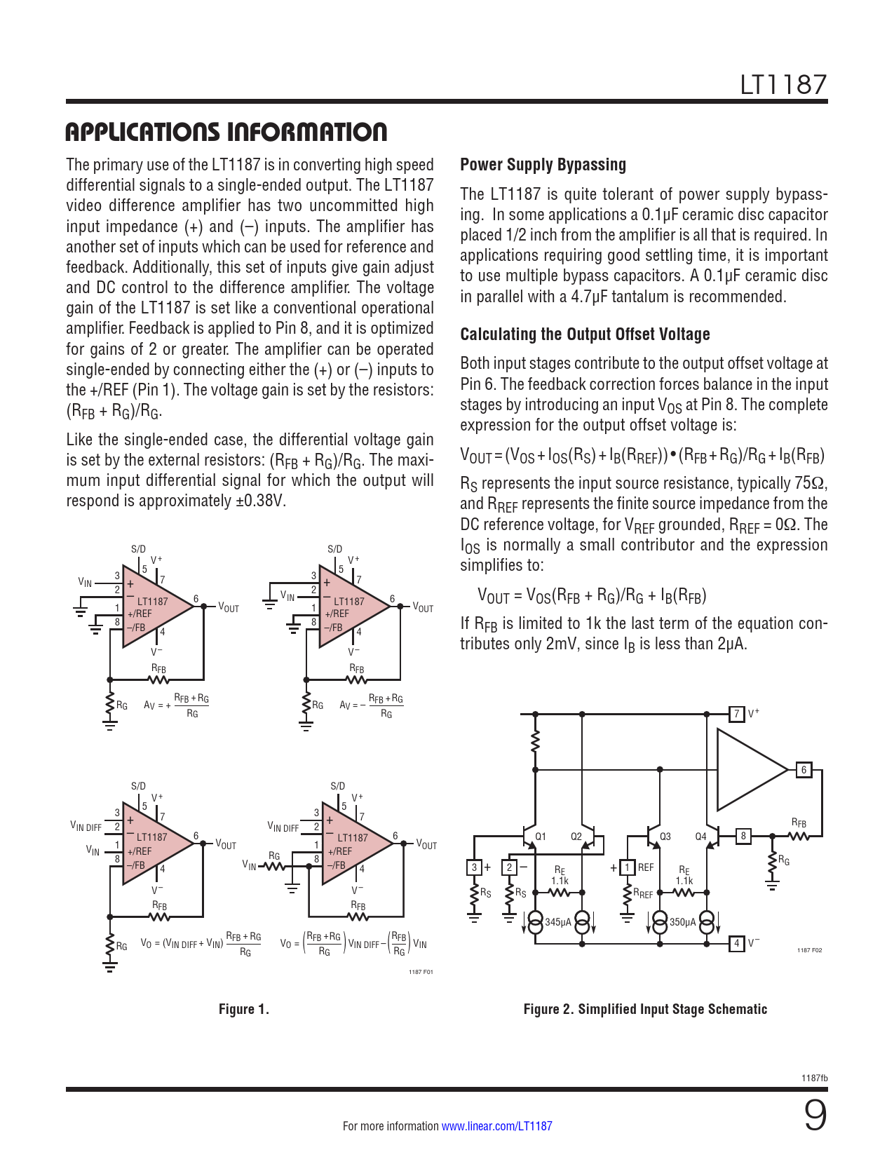 LT1187 APPLICATIONS INFORMATION The primary use of the LT1187 is in converting high speed Power Supply Bypassing differential signals to a single-ended output. The LT1187 The LT1187 is quite tolerant of power supply bypass- video difference amplifier has two uncommitted high ing. In some applications a 0.1µF ceramic disc capacitor input impedance (+) and (–) inputs. The amplifier has placed 1/2 inch from the amplifier is all that is required. In another set of inputs which can be used for reference and applications requiring good settling time, it is important feedback. Additionally, this set of inputs give gain adjust to use multiple bypass capacitors. A 0.1µF ceramic disc and DC control to the difference amplifier. The voltage in parallel with a 4.7µF tantalum is recommended. gain of the LT1187 is set like a conventional operational amplifier. Feedback is applied to Pin 8, and it is optimized Calculating the Output Offset Voltage for gains of 2 or greater. The amplifier can be operated single-ended by connecting either the (+) or (–) inputs to Both input stages contribute to the output offset voltage at the +/REF (Pin 1). The voltage gain is set by the resistors: Pin 6. The feedback correction forces balance in the input (R stages by introducing an input V FB + RG)/RG. OS at Pin 8. The complete expression for the output offset voltage is: Like the single-ended case, the differential voltage gain is set by the external resistors: (R V FB + RG)/RG. The maxi- OUT = (VOS + IOS(RS) + IB(RREF)) • (RFB + RG)/RG + IB(RFB) mum input differential signal for which the output wil RS represents the input source resistance, typically 75Ω, respond is approximately ±0.38V. and RREF represents the finite source impedance from the DC reference voltage, for VREF grounded, RREF = 0Ω. The S/D S/D IOS is normally a smal contributor and the expression V+ V+ 5 5 simplifies to: 3 V 7 3 IN + 7 + 2 – 2 V LT1187 6 IN – LT1187 6 VOUT = VOS(RFB + RG)/RG + IB(RFB) 1 OUT V 1 OUT V +/REF +/REF 8 8 –/FB –/FB If R 4 4 FB is limited to 1k the last term of the equation con- tributes only 2mV, since I V– V– B is less than 2µA. RFB RFB R RG R R R G G A FB + FB + V = + RG AV = – RG RG 7 V+ 6 S/D S/D V+ V+ 5 5 3 7 + 3 7 V + R IN DIFF 2 – VIN DIFF 2 FB LT1187 6 – LT1187 6 Q1 Q2 Q3 Q4 8 1 OUT V 1 IN V +/REF +/REF OUT V 8 RG 8 –/FB RG 4 VIN –/FB 4 3 + 2 – R + 1 REF E RE 1.1k 1.1k V– V– RS RS RREF RFB RFB 345µA 350µA RFB + RG R RG R V R O = (VIN DIFF + VIN) V FB + FB O = G ( – 4 V– R ( VIN DIFF ( R ( VIN RG G G 1187 F02 1187 F01 Figure 1.Figure 2. Simplified Input Stage Schematic 1187fb For more information www.linear.com/LT1187 9 Document Outline Features Applications Typical Application Description Absolute Maximum Ratings Pin Configuration Order Information ±5V Electrical Characteristics 5V Electrical Characteristics Typical Performance Characteristics Applications Information Simplified Schematic Package Description Revision History Related Parts
