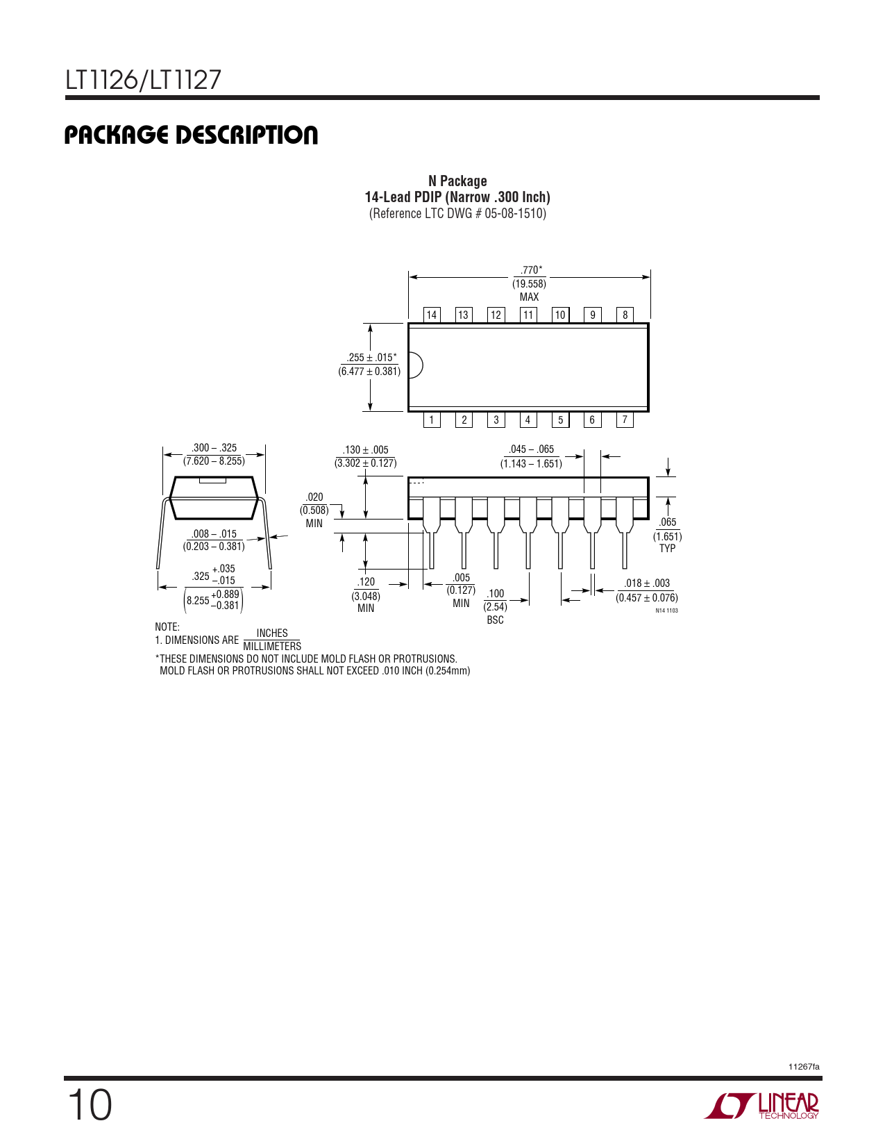 (Reference LTC DWG # 05-08-1510) .770* (19.558) MAX 14 13 12 11 10 9 8 .255 ± .015* (6.477 ± 0.381) 1 2 3 4 5 6 7 .300 – .325 .130 ± .005 .045 – .065 (7.620 – 8.255) (3.302 ± 0.127) (1.143 – 1.651) .020 (0.508) MIN .065 .008 – .015 (1.651) (0.203 – 0.381) TYP +.035 .325 –.015 .120 .005 .018 ± .003 (0.127) +0.889 (3.048) .100 (0.457 8.255 ± 0.076) ( ) –0.381 MIN MIN (2.54) N14 1103 BSC NOTE: INCHES 1. DIMENSIONS ARE MILLIMETERS *THESE DIMENSIONS DO NOT INCLUDE MOLD FLASH OR PROTRUSIONS. MOLD FLASH OR PROTRUSIONS SHALL NOT EXCEED .010 INCH (0.254mm) 11267fa 10