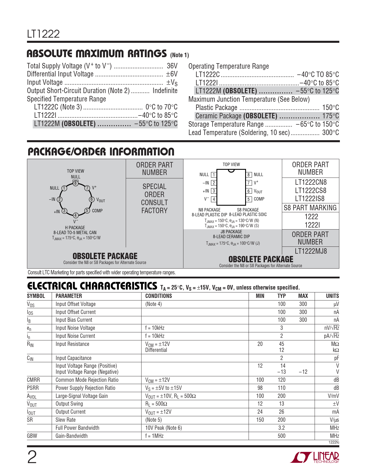 – 55°C to 125°C Specified Temperature Range Maximum Junction Temperature (See Below) LT1222C (Note 3) ... 0°C to 70°C Plastic Package ... 150°C LT1222I ...–40°C to 85°C Ceramic Package