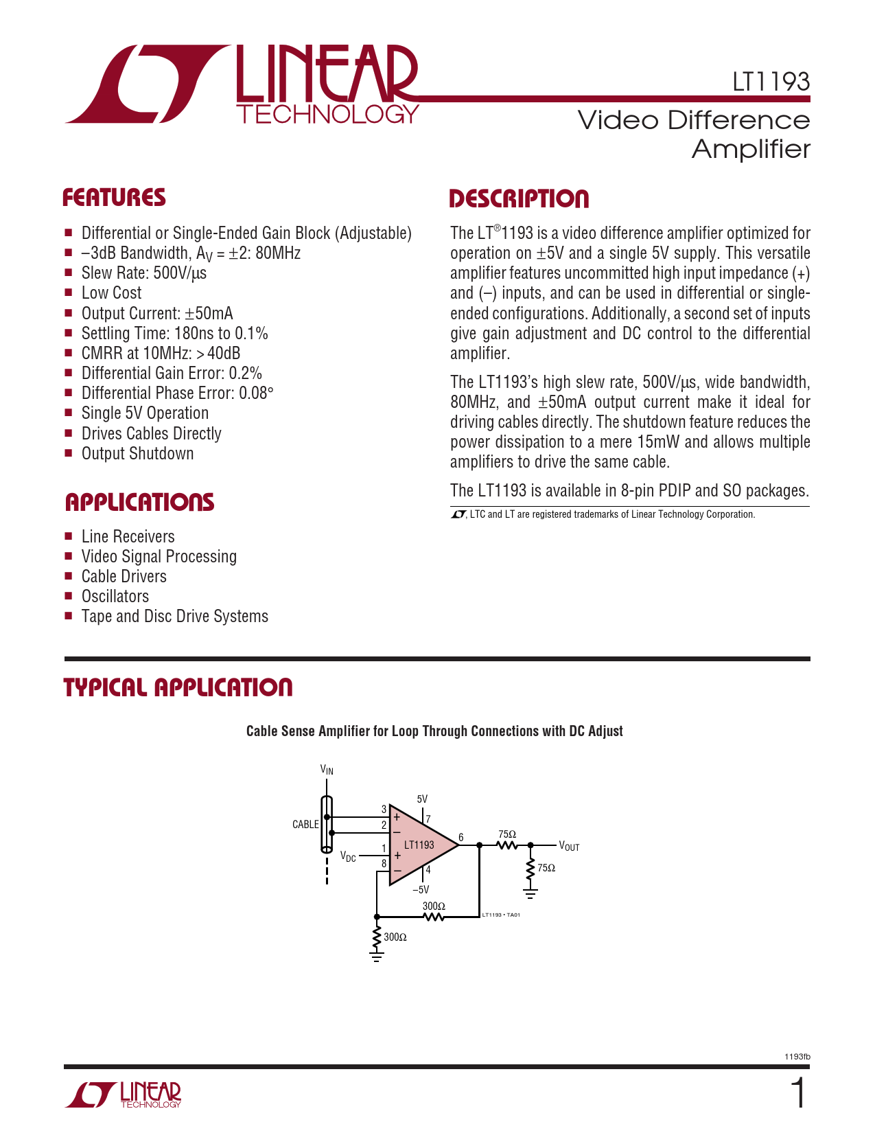 , LTC and LT are registered trademarks of Linear Technology Corporation. ■ Line Receivers ■ Video Signal Processing ■ Cable Drivers ■ Oscillators ■ Tape and Disc Drive Systems