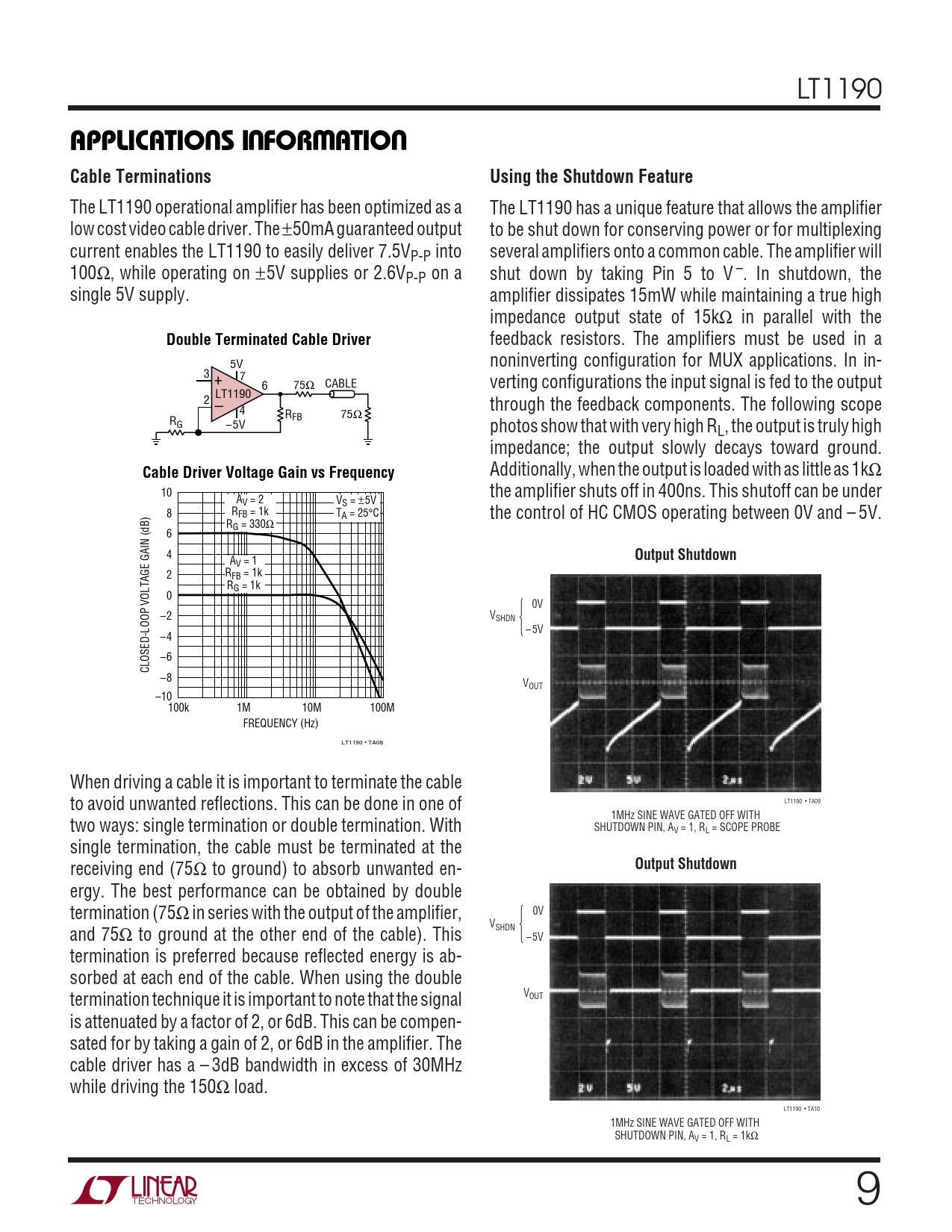 receiving end (75Ω to ground) to absorb unwanted en- ergy. The best performance can be obtained by double termination (75Ω in series with the output of the amplifier, 0V V and 75Ω to ground at the other end of the cable). This SHDN – 5V termination is preferred because reflected energy is ab- sorbed at each end of the cable. When using the double termination technique it is important to note that the signal VOUT is attenuated by a factor of 2, or 6dB. This can be compen- sated for by taking a gain of 2, or 6dB in the amplifier. The cable driver has a – 3dB bandwidth in excess of 30MHz while driving the 150Ω load. LT1190 • TA10 1MHz SINE WAVE GATED OFF WITH SHUTDOWN PIN, AV = 1, RL = 1kΩ 9