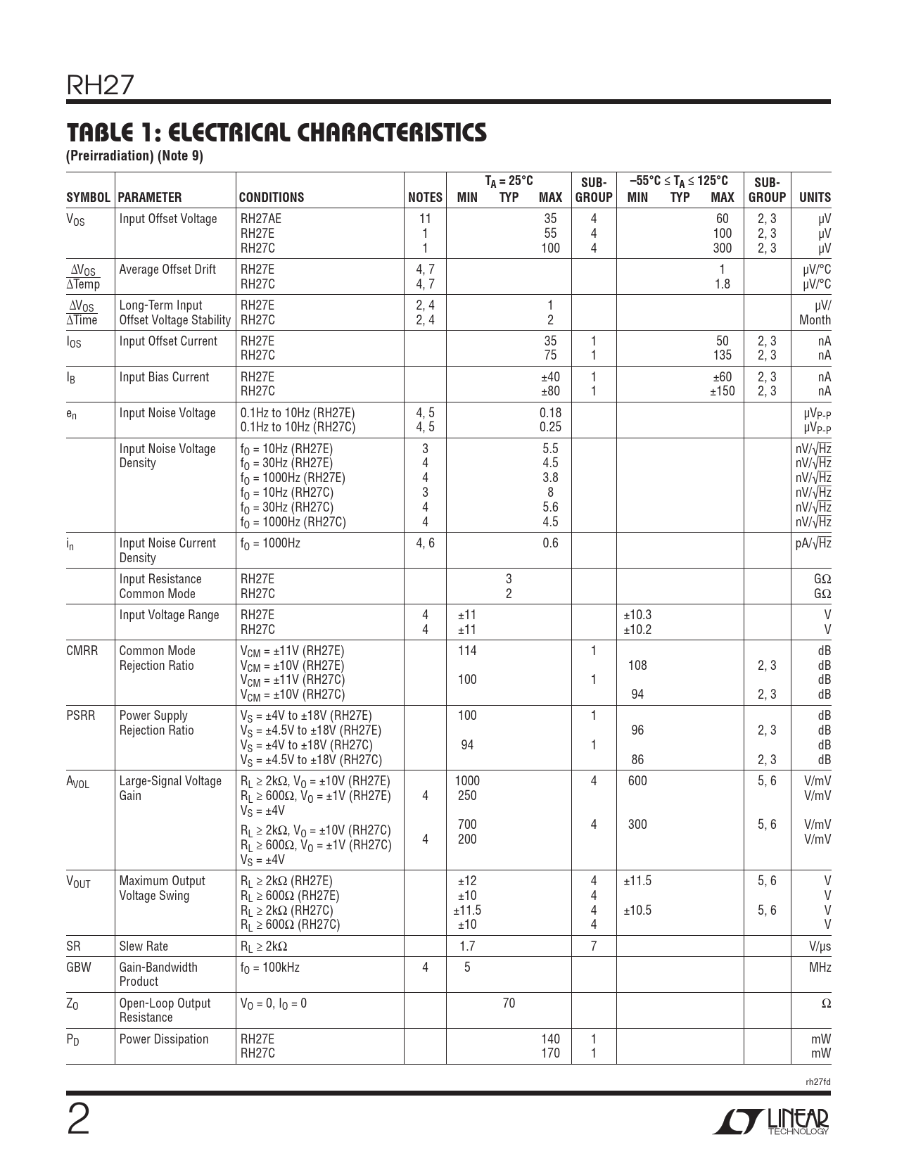 VOS Input Offset Voltage RH27AE 11 35 4 60 2, 3 μV RH27E 1 55 4 100 2, 3 μV RH27C 1 100 4 300 2, 3 μV ΔVOS Average Offset Drift RH27E 4, 7 1 μV/°C ΔTemp RH27C 4, 7 1.8 μV/°C ΔVOS Long-Term Input RH27E 2, 4 1 μV/ ΔTime Offset Voltage Stability RH27C 2, 4 2 Month IOS Input Offset Current RH27E 35 1 50 2, 3 nA RH27C 75 1 135 2, 3 nA IB Input Bias Current RH27E ±40 1 ±60 2, 3 nA RH27C ±80 1 ±150 2, 3 nA en Input Noise Voltage 0.1Hz to 10Hz (RH27E) 4, 5 0.18 μVP-P 0.1Hz to 10Hz (RH27C) 4, 5 0.25 μVP-P Input Noise Voltage fO = 10Hz (RH27E) 3 5.5 nV/√Hz Density fO = 30Hz (RH27E) 4 4.5 nV/√Hz fO = 1000Hz (RH27E) 4 3.8 nV/√Hz fO = 10Hz (RH27C) 3 8 nV/√Hz fO = 30Hz (RH27C) 4 5.6 nV/√Hz fO = 1000Hz (RH27C) 4 4.5 nV/√Hz in Input Noise Current fO = 1000Hz 4, 6 0.6 pA/√Hz Density Input Resistance RH27E 3 GΩ Common Mode RH27C 2 GΩ Input Voltage Range RH27E 4 ±11 ±10.3 V RH27C 4 ±11 ±10.2 V CMRR Common Mode VCM = ±11V (RH27E) 114 1 dB Rejection Ratio VCM = ±10V (RH27E) 108 2, 3 dB VCM = ±11V (RH27C) 100 1 dB VCM = ±10V (RH27C) 94 2, 3 dB PSRR Power Supply VS = ±4V to ±18V (RH27E) 100 1 dB Rejection Ratio VS = ±4.5V to ±18V (RH27E) 96 2, 3 dB VS = ±4V to ±18V (RH27C) 94 1 dB VS = ±4.5V to ±18V (RH27C) 86 2, 3 dB AVOL Large-Signal Voltage RL ≥ 2kΩ, VO = ±10V (RH27E) 1000 4 600 5, 6 V/mV Gain RL ≥ 600Ω, VO = ±1V (RH27E) 4 250 V/mV VS = ±4V R 700 4 300 5, 6 V/mV L ≥ 2kΩ, VO = ±10V (RH27C) R 4 200 V/mV L ≥ 600Ω, VO = ±1V (RH27C) VS = ±4V VOUT Maximum Output RL ≥ 2kΩ (RH27E) ±12 4 ±11.5 5, 6 V Voltage Swing RL ≥ 600Ω (RH27E) ±10 4 V RL ≥ 2kΩ (RH27C) ±11.5 4 ±10.5 5, 6 V RL ≥ 600Ω (RH27C) ±10 4 V SR Slew Rate RL ≥ 2kΩ 1.7 7 V/μs GBW Gain-Bandwidth fO = 100kHz 4 5 MHz Product ZO Open-Loop Output VO = 0, IO = 0 70 Ω Resistance PD Power Dissipation RH27E 140 1 mW RH27C 170 1 mW rh27fd 2