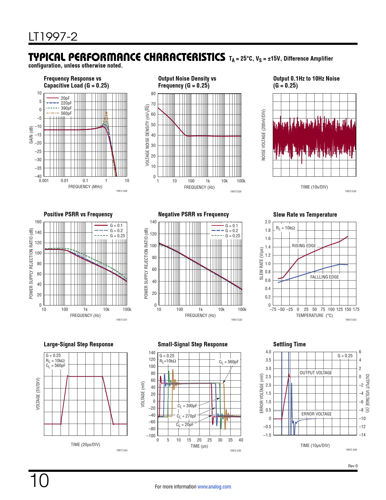 160 140 2.0 G = 0.1 G = 0.1 G = 0.2 RL = 10kΩ 140 G = 0.2 1.8 G = 0.25 120 G = 0.25 TIO (dB) 1.6 120 TIO (dB) 100 1.4 RISING EDGE 100 /µs) 80 1.2 80 TE (V 1.0 Y REJECTION RA 60 Y REJECTION RA 60 0.8 FALLLING EDGE SLEW RA 40 0.6 40 0.4 20 20 POWER SUPPL POWER SUPPL 0.2 0 0 0 10 100 1k 10k 100k 10 100 1k 10k 100k –75 –50 –25 0 25 50 75 100 125 150 175 FREQUENCY (Hz) FREQUENCY (Hz) TEMPERATURE (°C) 19972 G31 19972 G32 19972 G33