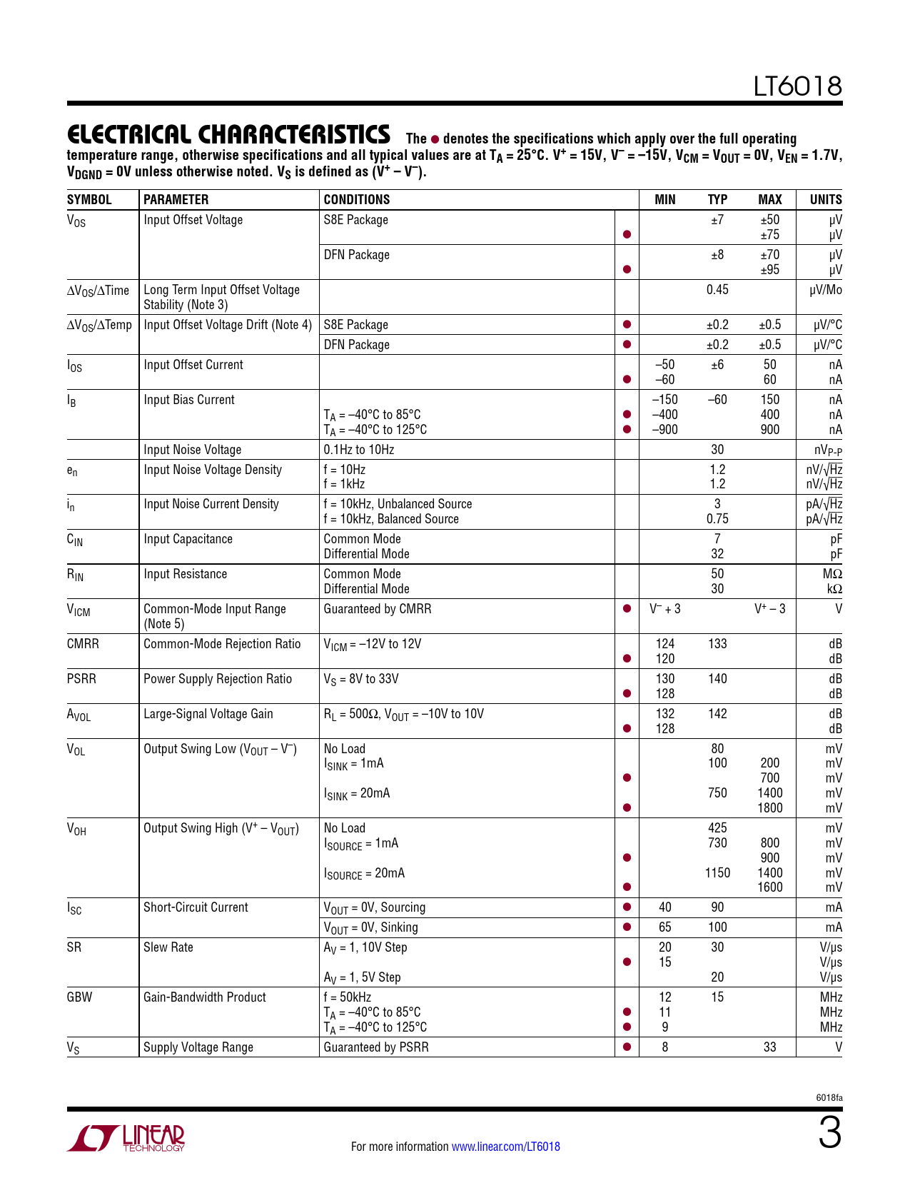 VOS Input Offset Voltage S8E Package ±7 ±50 µV l ±75 µV DFN Package ±8 ±70 µV l ±95 µV ∆VOS/∆Time Long Term Input Offset Voltage 0.45 µV/Mo Stability (Note 3) ∆VOS/∆Temp Input Offset Voltage Drift (Note 4) S8E Package l ±0.2 ±0.5 µV/°C DFN Package l ±0.2 ±0.5 µV/°C IOS Input Offset Current –50 ±6 50 nA l –60 60 nA IB Input Bias Current –150 –60 150 nA TA = –40°C to 85°C l –400 400 nA TA = –40°C to 125°C l –900 900 nA Input Noise Voltage 0.1Hz to 10Hz 30 nVP-P en Input Noise Voltage Density f = 10Hz 1.2 nV/√Hz f = 1kHz 1.2 nV/√Hz in Input Noise Current Density f = 10kHz, Unbalanced Source 3 pA/√Hz f = 10kHz, Balanced Source 0.75 pA/√Hz CIN Input Capacitance Common Mode 7 pF Differential Mode 32 pF RIN Input Resistance Common Mode 50 MΩ Differential Mode 30 kΩ VICM Common-Mode Input Range Guaranteed by CMRR l V– + 3 V+ – 3 V (Note 5) CMRR Common-Mode Rejection Ratio VICM = –12V to 12V 124 133 dB l 120 dB PSRR Power Supply Rejection Ratio VS = 8V to 33V 130 140 dB l 128 dB AVOL Large-Signal Voltage Gain RL = 500Ω, VOUT = –10V to 10V 132 142 dB l 128 dB VOL Output Swing Low (VOUT – V–) No Load 80 mV ISINK = 1mA 100 200 mV l 700 mV ISINK = 20mA 750 1400 mV l 1800 mV VOH Output Swing High (V+ – VOUT) No Load 425 mV ISOURCE = 1mA 730 800 mV l 900 mV ISOURCE = 20mA 1150 1400 mV l 1600 mV ISC Short-Circuit Current VOUT = 0V, Sourcing l 40 90 mA VOUT = 0V, Sinking l 65 100 mA SR Slew Rate AV = 1, 10V Step 20 30 V/µs l 15 V/µs AV = 1, 5V Step 20 V/µs GBW Gain-Bandwidth Product f = 50kHz 12 15 MHz TA = –40°C to 85°C l 11 MHz TA = –40°C to 125°C l 9 MHz VS Supply Voltage Range Guaranteed by PSRR l 8 33 V 6018fa For more information www.linear.com/LT6018 3 Document Outline Features Description Applications Typical Application Absolute Maximum Ratings Pin Configuration Order Information Electrical Characteristics Typical Performance Characteristics Pin Functions Simplified Schematic Applications Information Typical Applications Package Description Revision History Typical Applications Related Parts