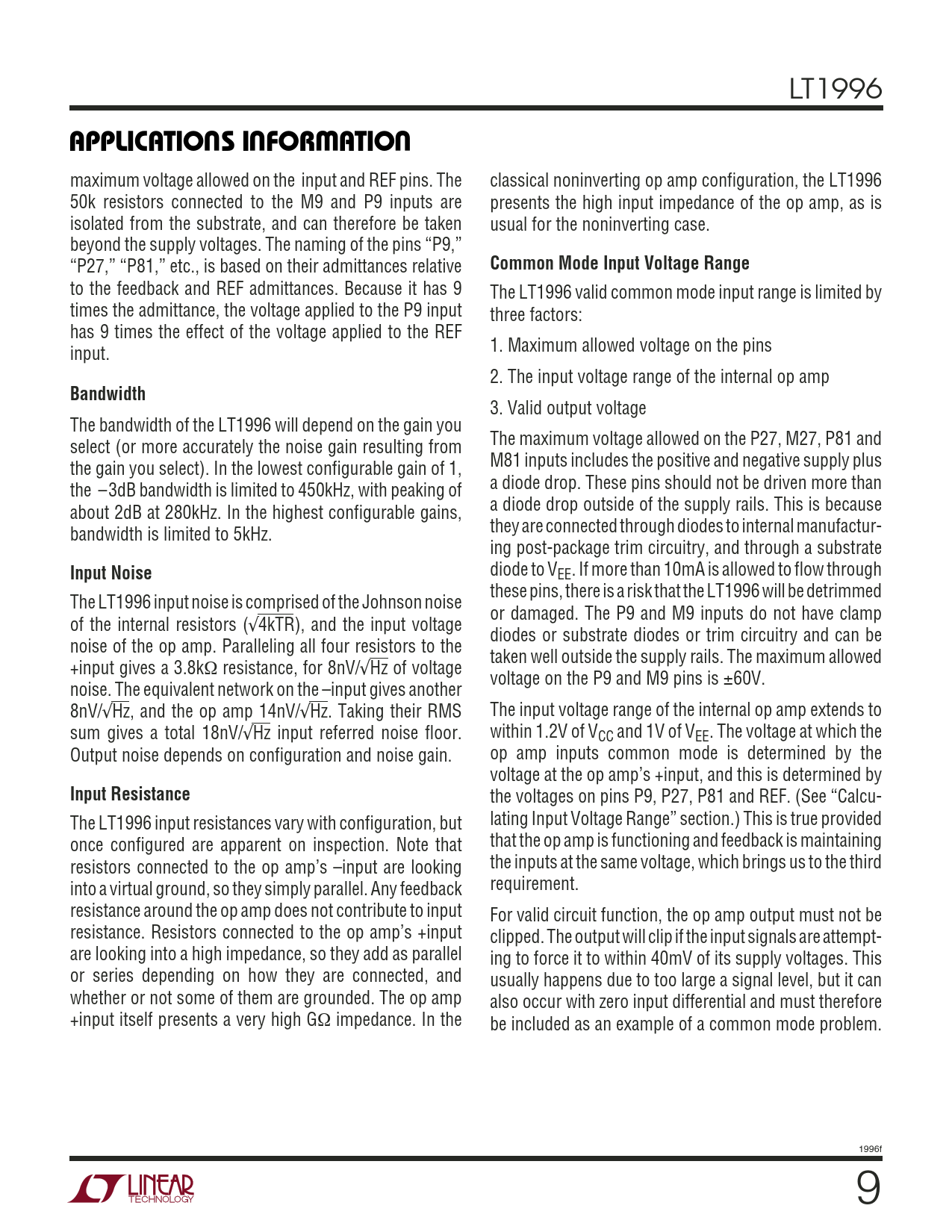 LT1996 UUWUAPPLICATIO S I FOR ATIO maximum voltage allowed on the input and REF pins. The classical noninverting op amp configuration, the LT1996 50k resistors connected to the M9 and P9 inputs are presents the high input impedance of the op amp, as is isolated from the substrate, and can therefore be taken usual for the noninverting case. beyond the supply voltages. The naming of the pins “P9,” “P27,” “P81,” etc., is based on their admittances relative Common Mode Input Voltage Range to the feedback and REF admittances. Because it has 9 The LT1996 valid common mode input range is limited by times the admittance, the voltage applied to the P9 input three factors: has 9 times the effect of the voltage applied to the REF input. 1. Maximum allowed voltage on the pins 2. The input voltage range of the internal op amp Bandwidth 3. Valid output voltage The bandwidth of the LT1996 will depend on the gain you select (or more accurately the noise gain resulting from The maximum voltage allowed on the P27, M27, P81 and the gain you select). In the lowest configurable gain of 1, M81 inputs includes the positive and negative supply plus the –3dB bandwidth is limited to 450kHz, with peaking of a diode drop. These pins should not be driven more than about 2dB at 280kHz. In the highest configurable gains, a diode drop outside of the supply rails. This is because bandwidth is limited to 5kHz. they are connected through diodes to internal manufactur- ing post-package trim circuitry, and through a substrate Input Noise diode to VEE. If more than 10mA is allowed to flow through these pins, there is a risk that the LT1996 will be detrimmed The LT1996 input noise is comprised of the Johnson noise or damaged. The P9 and M9 inputs do not have clamp of the internal resistors (√4kTR), and the input voltage diodes or substrate diodes or trim circuitry and can be noise of the op amp. Paralleling all four resistors to the taken well outside the supply rails. The maximum allowed +input gives a 3.8kΩ resistance, for 8nV/√Hz of voltage voltage on the P9 and M9 pins is ±60V. noise. The equivalent network on the –input gives another 8nV/√Hz, and the op amp 14nV/√Hz. Taking their RMS The input voltage range of the internal op amp extends to sum gives a total 18nV/√Hz input referred noise floor. within 1.2V of VCC and 1V of VEE. The voltage at which the Output noise depends on configuration and noise gain. op amp inputs common mode is determined by the voltage at the op amp’s +input, and this is determined by Input Resistance the voltages on pins P9, P27, P81 and REF. (See “Calcu- The LT1996 input resistances vary with configuration, but lating Input Voltage Range” section.) This is true provided once configured are apparent on inspection. Note that that the op amp is functioning and feedback is maintaining resistors connected to the op amp’s –input are looking the inputs at the same voltage, which brings us to the third into a virtual ground, so they simply parallel. Any feedback requirement. resistance around the op amp does not contribute to input For valid circuit function, the op amp output must not be resistance. Resistors connected to the op amp’s +input clipped. The output will clip if the input signals are attempt- are looking into a high impedance, so they add as parallel ing to force it to within 40mV of its supply voltages. This or series depending on how they are connected, and usually happens due to too large a signal level, but it can whether or not some of them are grounded. The op amp also occur with zero input differential and must therefore +input itself presents a very high GΩ impedance. In the be included as an example of a common mode problem. 1996f 9