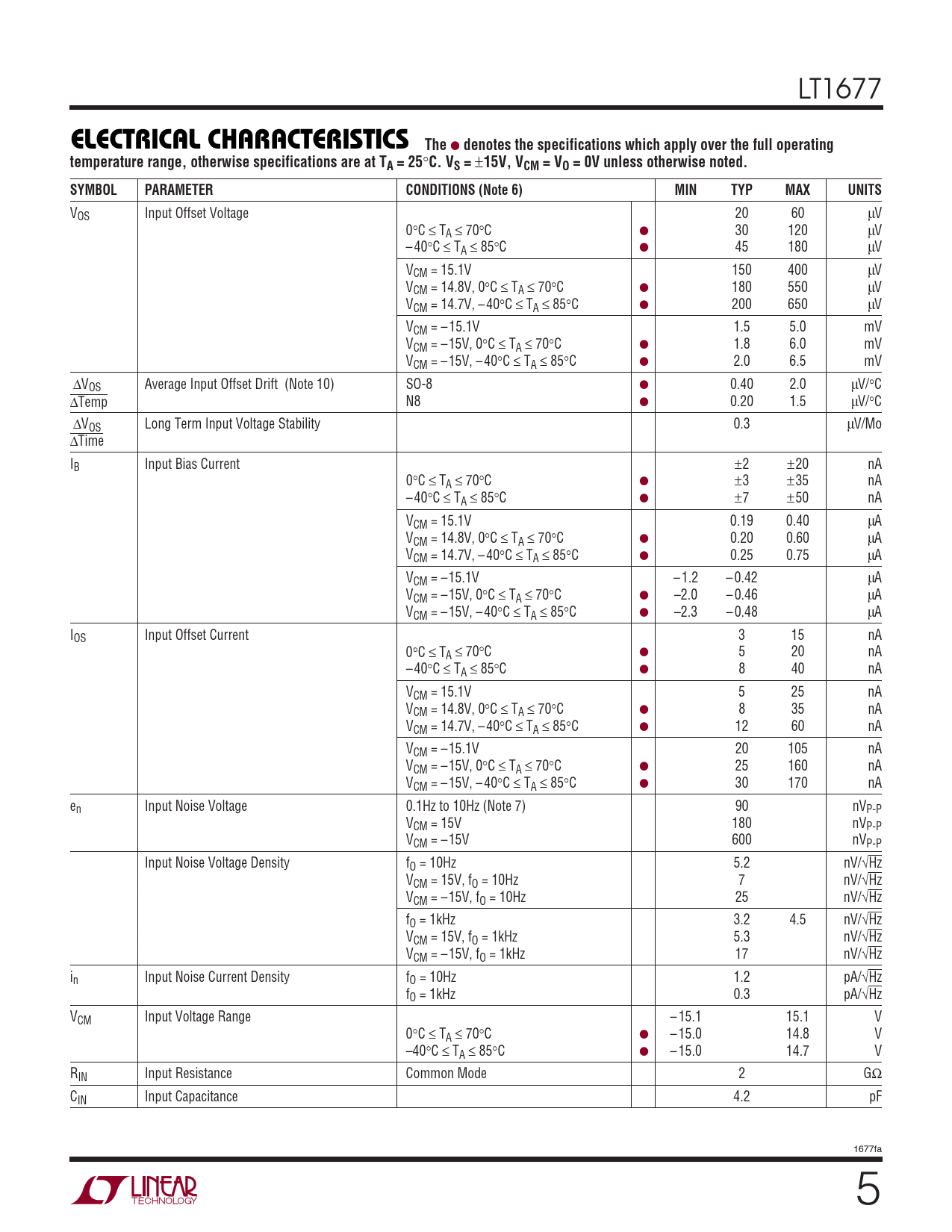VOS Input Offset Voltage 20 60 µV 0°C ≤ TA ≤ 70°C ● 30 120 µV – 40°C ≤ TA ≤ 85°C ● 45 180 µV VCM = 15.1V 150 400 µV VCM = 14.8V, 0°C ≤ TA ≤ 70°C ● 180 550 µV VCM = 14.7V, – 40°C ≤ TA ≤ 85°C ● 200 650 µV VCM = – 15.1V 1.5 5.0 mV VCM = –15V, 0°C ≤ TA ≤ 70°C ● 1.8 6.0 mV VCM = –15V, – 40°C ≤ TA ≤ 85°C ● 2.0 6.5 mV ∆VOS Average Input Offset Drift (Note 10) SO-8 ● 0.40 2.0 µV/°C ∆Temp N8 ● 0.20 1.5 µV/°C ∆VOS Long Term Input Voltage Stability 0.3 µV/Mo ∆Time IB Input Bias Current ±2 ±20 nA 0°C ≤ TA ≤ 70°C ● ±3 ±35 nA – 40°C ≤ TA ≤ 85°C ● ±7 ±50 nA VCM = 15.1V 0.19 0.40 µA VCM = 14.8V, 0°C ≤ TA ≤ 70°C ● 0.20 0.60 µA VCM = 14.7V, – 40°C ≤ TA ≤ 85°C ● 0.25 0.75 µA VCM = –15.1V – 1.2 – 0.42 µA VCM = –15V, 0°C ≤ TA ≤ 70°C ● –2.0 – 0.46 µA VCM = –15V, – 40°C ≤ TA ≤ 85°C ● –2.3 – 0.48 µA IOS Input Offset Current 3 15 nA 0°C ≤ TA ≤ 70°C ● 5 20 nA – 40°C ≤ TA ≤ 85°C ● 8 40 nA VCM = 15.1V 5 25 nA VCM = 14.8V, 0°C ≤ TA ≤ 70°C ● 8 35 nA VCM = 14.7V, – 40°C ≤ TA ≤ 85°C ● 12 60 nA VCM = –15.1V 20 105 nA VCM = –15V, 0°C ≤ TA ≤ 70°C ● 25 160 nA VCM = –15V, – 40°C ≤ TA ≤ 85°C ● 30 170 nA en Input Noise Voltage 0.1Hz to 10Hz (Note 7) 90 nVP-P VCM = 15V 180 nVP-P VCM = –15V 600 nVP-P Input Noise Voltage Density fO = 10Hz 5.2 nV/√Hz VCM = 15V, fO = 10Hz 7 nV/√Hz VCM = –15V, fO = 10Hz 25 nV/√Hz fO = 1kHz 3.2 4.5 nV/√Hz VCM = 15V, fO = 1kHz 5.3 nV/√Hz VCM = –15V, fO = 1kHz 17 nV/√Hz in Input Noise Current Density fO = 10Hz 1.2 pA/√Hz fO = 1kHz 0.3 pA/√Hz VCM Input Voltage Range – 15.1 15.1 V 0°C ≤ TA ≤ 70°C ● – 15.0 14.8 V –40°C ≤ TA ≤ 85°C ● – 15.0 14.7 V RIN Input Resistance Common Mode 2 GΩ CIN Input Capacitance 4.2 pF 1677fa 5