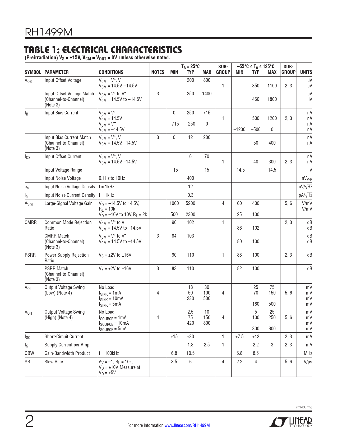 VOS Input Offset Voltage VCM = V+, V– 200 800 µV VCM = 14.5V, –14.5V 1 350 1100 2, 3 µV Input Offset Voltage Match VCM = V+ to V– 3 250 1400 µV (Channel-to-Channel) VCM = 14.5V to –14.5V 450 1800 µV (Note 3) IB Input Bias Current VCM = V+ 0 250 715 nA VCM = 14.5V 1 500 1200 2, 3 nA VCM = V– –715 –250 0 nA VCM = –14.5V –1200 –500 0 nA Input Bias Current Match VCM = V+, V– 3 0 12 200 nA (Channel-to-Channel) VCM = 14.5V, –14.5V 50 400 nA (Note 3) IOS Input Offset Current VCM = V+, V– 6 70 nA VCM = 14.5V, –14.5V 1 40 300 2, 3 nA Input Voltage Range –15 15 –14.5 14.5 V Input Noise Voltage 0.1Hz to 10Hz 400 nVP-P en Input Noise Voltage Density f = 1kHz 12 nV/√Hz in Input Noise Current Density f = 1kHz 0.3 pA/√Hz AVOL Large-Signal Voltage Gain VO = –14.5V to 14.5V, 1000 5200 4 60 400 5, 6 V/mV RL = 10k V/mV VO = –10V to 10V, RL = 2k 500 2300 25 100 CMRR Common Mode Rejection VCM = V+ to V– 90 102 1 2, 3 dB Ratio VCM = 14.5V to –14.5V 86 102 dB CMRR Match VCM = V+ to V– 3 84 103 dB (Channel-to-Channel) VCM = 14.5V to –14.5V 80 100 dB (Note 3) PSRR Power Supply Rejection VS = ±2V to ±16V 90 110 1 88 100 2, 3 dB Ratio PSRR Match VS = ±2V to ±16V 3 83 110 82 100 dB (Channel-to-Channel) (Note 3) VOL Output Voltage Swing No Load 18 30 25 75 mV (Low) (Note 4) ISINK = 1mA 4 50 100 4 70 150 5, 6 mV ISINK = 10mA 230 500 mV ISINK = 5mA 180 500 mV VOH Output Voltage Swing No Load 2.5 10 5 25 mV (High) (Note 4) ISOURCE = 1mA 4 75 150 4 100 250 5, 6 mV ISOURCE = 10mA 420 800 mV ISOURCE = 5mA 300 800 mV ISC Short-Circuit Current ±15 ±30 1 ±7.5 ±12 2, 3 mA IS Supply Current per Amp 1.8 2.5 1 2.2 3 2, 3 mA GBW Gain-Bandwidth Product f = 100kHz 6.8 10.5 5.8 8.5 MHz SR Slew Rate AV = –1, RL = 10k, 3.5 6 4 2.2 4 5, 6 V/µs VO = ±10V, Measure at VO = ±5V rh1499mfg 2 For more information www.linear.com/RH1499M Document Outline Description Absolute Maximum Ratings Burn-In Circuit Package Information Table 1: Electrical Characteristics Table 1A: Electrical Characteristics Table 2: Electrical Characteristics Table 2A: Electrical Characteristics Table 2: Electrical Test Requirements Total Dose Bias Circuit Typical Performance Characteristics