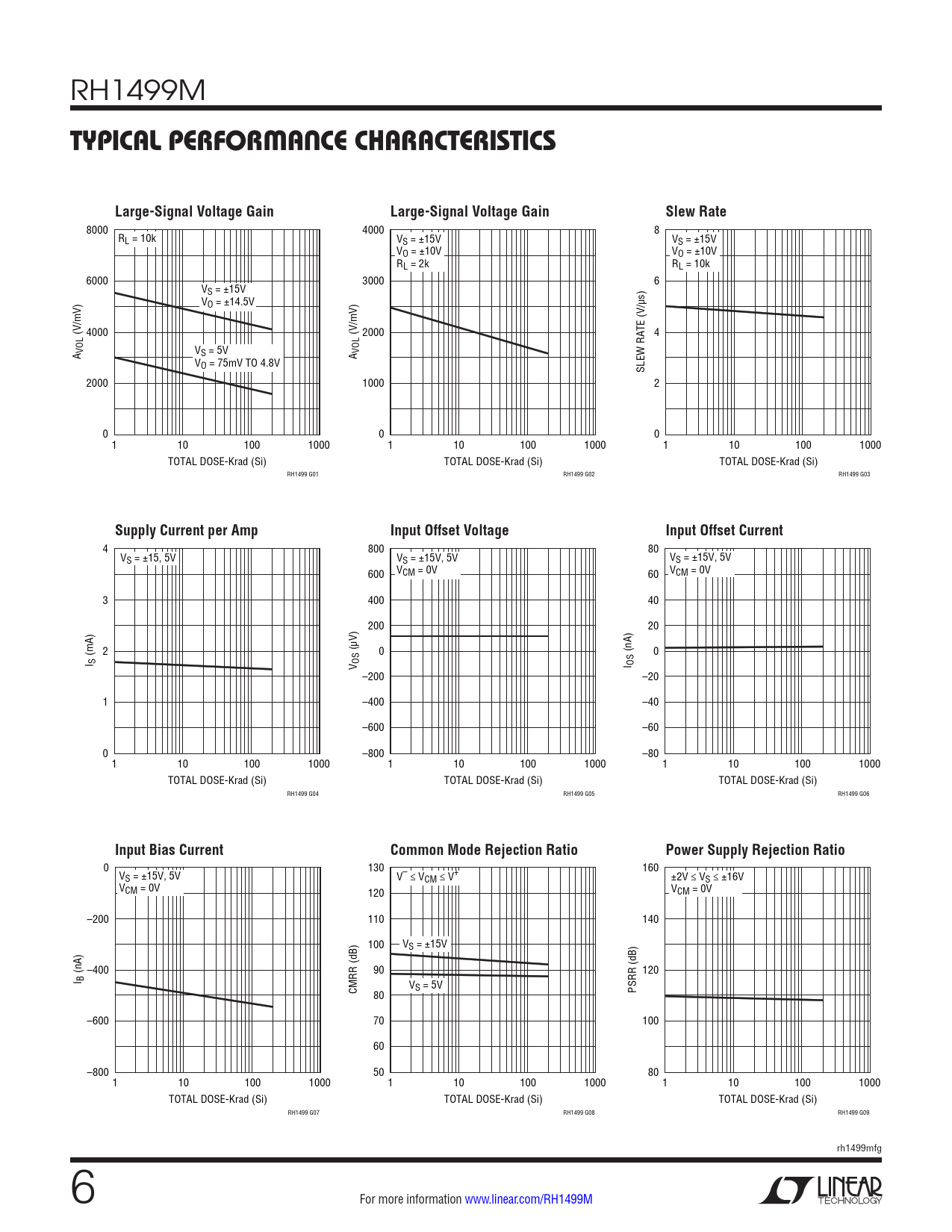 4 800 80 VS = ±15, 5V V V S = ±15V, 5V S = ±15V, 5V 600 VCM = 0V 60 VCM = 0V 3 400 40 200 20 (mA) 2 (µV) 0 (nA) 0 I S V OS I OS –200 –20 1 –400 –40 –600 –60 0 –800 –80 1 10 100 1000 1 10 100 1000 1 10 100 1000 TOTAL DOSE-Krad (Si) TOTAL DOSE-Krad (Si) TOTAL DOSE-Krad (Si) RH1499 G04 RH1499 G05 RH1499 G06