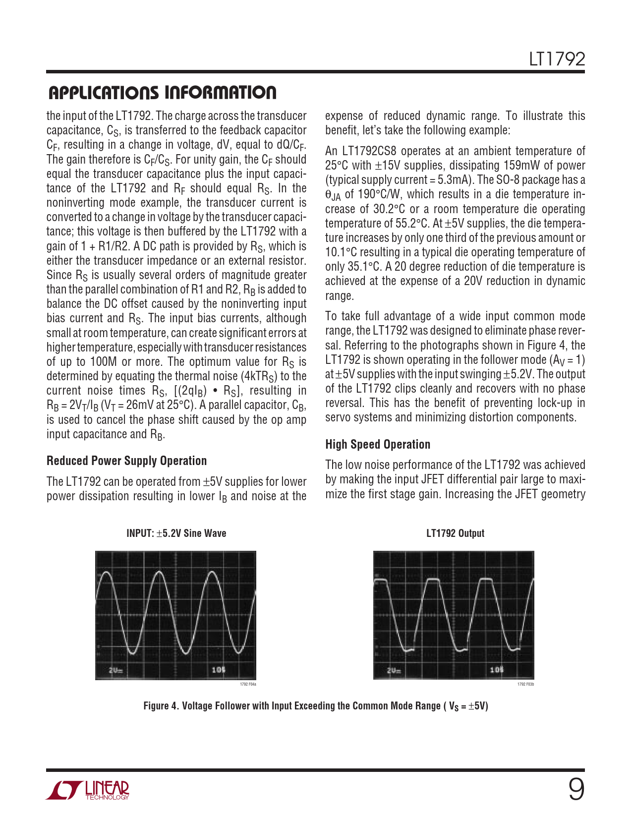 the input of the LT1792. The charge across the transducer expense of reduced dynamic range. To illustrate this capacitance, CS, is transferred to the feedback capacitor benefit, let’s take the following example: CF, resulting in a change in voltage, dV, equal to dQ/CF. An LT1792CS8 operates at an ambient temperature of The gain therefore is CF/CS. For unity gain, the CF should 25°C with ±15V supplies, dissipating 159mW of power equal the transducer capacitance plus the input capaci- (typical supply current = 5.3mA). The SO-8 package has a tance of the LT1792 and RF should equal RS. In the θ noninverting mode example, the transducer current is JA of 190°C/W, which results in a die temperature in- crease of 30.2°C or a room temperature die operating converted to a change in voltage by the transducer capaci- temperature of 55.2°C. At ±5V supplies, the die tempera- tance; this voltage is then buffered by the LT1792 with a ture increases by only one third of the previous amount or gain of 1 + R1/R2. A DC path is provided by RS, which is 10.1°C resulting in a typical die operating temperature of either the transducer impedance or an external resistor. only 35.1°C. A 20 degree reduction of die temperature is Since RS is usually several orders of magnitude greater achieved at the expense of a 20V reduction in dynamic than the parallel combination of R1 and R2, RB is added to range. balance the DC offset caused by the noninverting input bias current and R To take full advantage of a wide input common mode S. The input bias currents, although small at room temperature, can create significant errors at range, the LT1792 was designed to eliminate phase rever- higher temperature, especially with transducer resistances sal. Referring to the photographs shown in Figure 4, the of up to 100M or more. The optimum value for R LT1792 is shown operating in the follower mode (A S is V = 1) determined by equating the thermal noise (4kTR at ±5V supplies with the input swinging ±5.2V. The output S) to the current noise times R of the LT1792 clips cleanly and recovers with no phase S, [(2qIB) • RS], resulting in R reversal. This has the benefit of preventing lock-up in B = 2VT/IB (VT = 26mV at 25°C). A parallel capacitor, CB, is used to cancel the phase shift caused by the op amp servo systems and minimizing distortion components. input capacitance and RB.