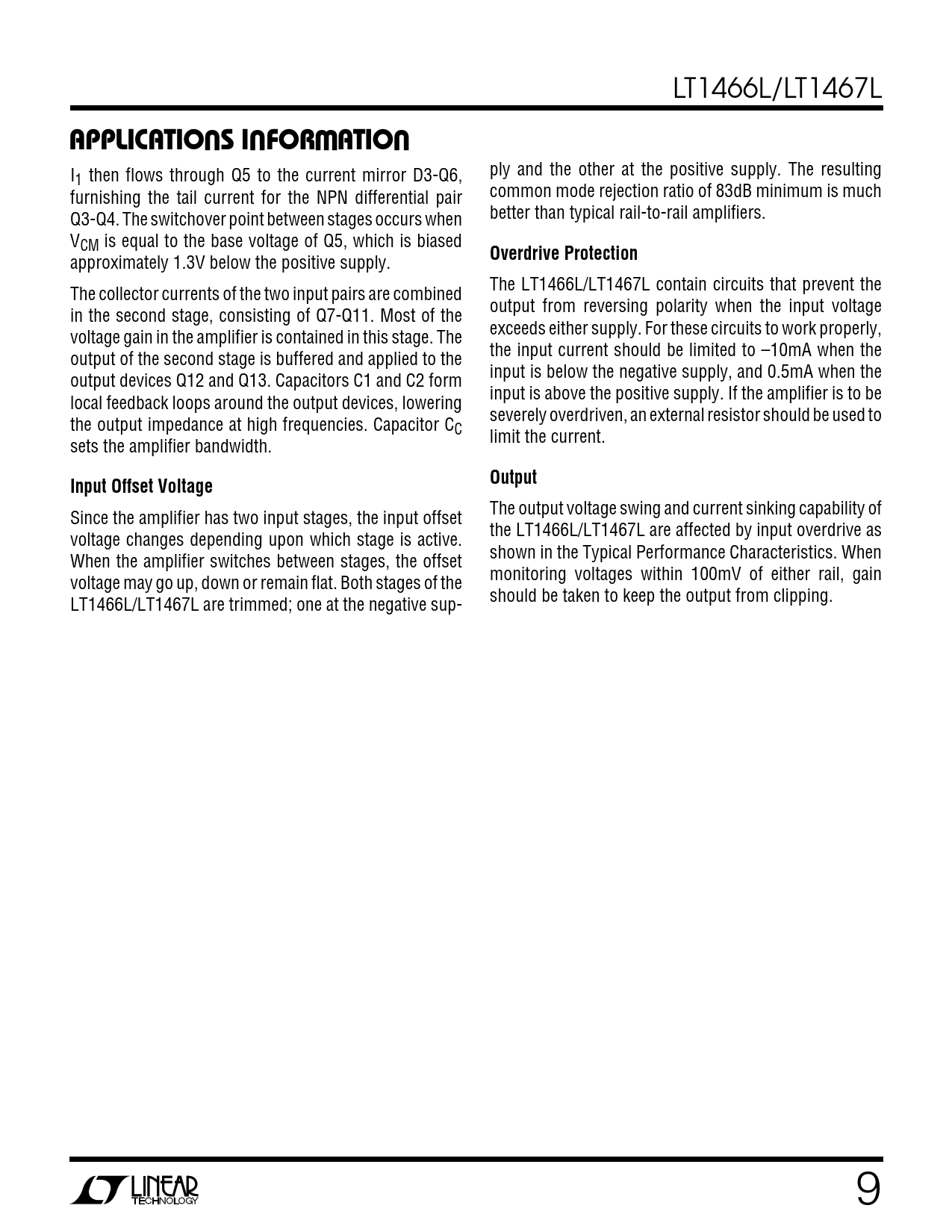 The output voltage swing and current sinking capability of Since the amplifier has two input stages, the input offset the LT1466L/LT1467L are affected by input overdrive as voltage changes depending upon which stage is active. shown in the Typical Performance Characteristics. When When the amplifier switches between stages, the offset monitoring voltages within 100mV of either rail, gain voltage may go up, down or remain flat. Both stages of the should be taken to keep the output from clipping. LT1466L/LT1467L are trimmed; one at the negative sup- 9