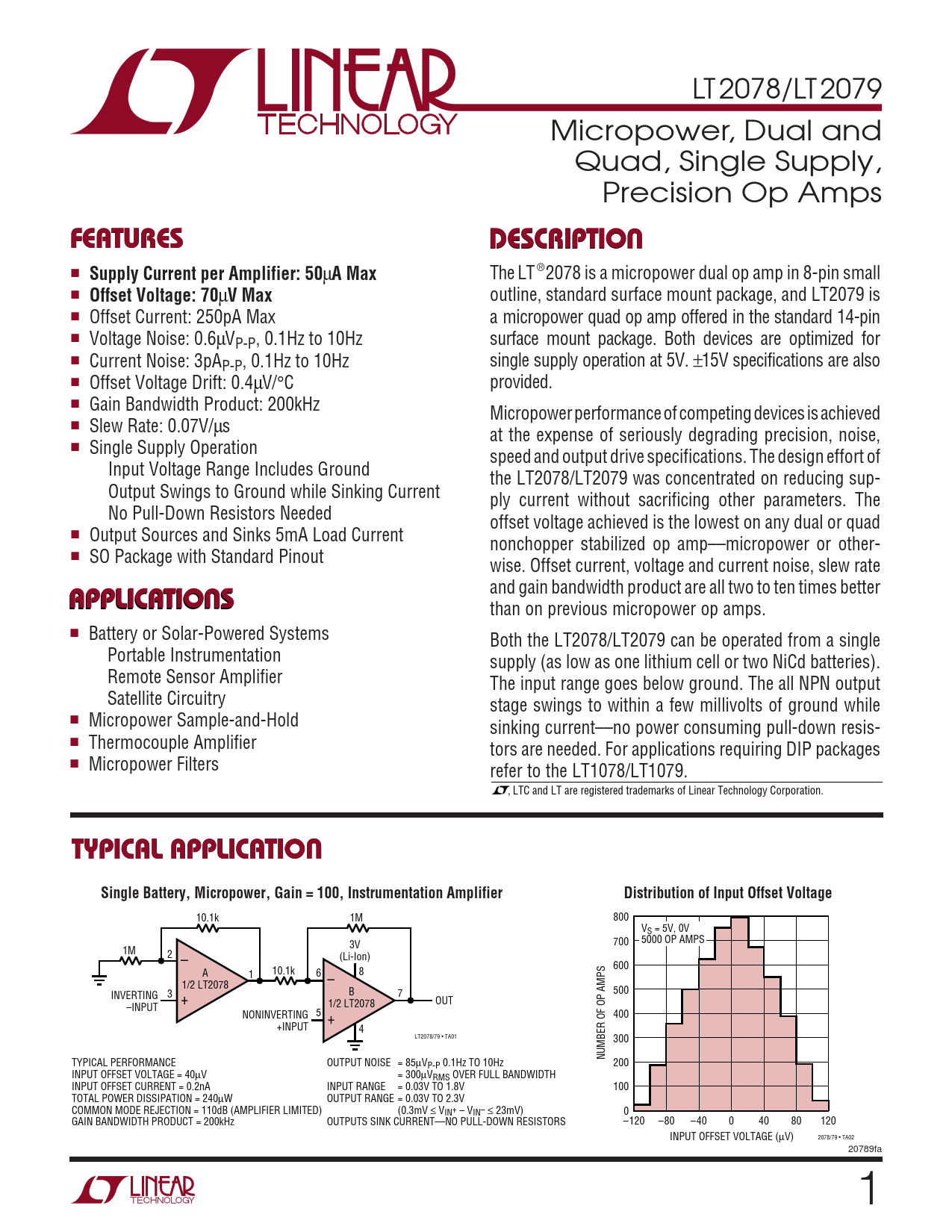 LT 2078/LT 2079 Micropower, Dual and Quad, Single Supply, Precision Op Amps UFEATURESFEADESCRIPTIONDESCRIPTIO ■ Supply Current per Amplifier: 50 µ A Max The LT ®2078 is a micropower dual op amp in 8-pin small ■ Offset Voltage: 70 µ V Max outline, standard surface mount package, and LT2079 is ■ Offset Current: 250pA Max a micropower quad op amp offered in the standard 14-pin ■ Voltage Noise: 0.6µVP-P, 0.1Hz to 10Hz surface mount package. Both devices are optimized for ■ Current Noise: 3pAP-P, 0.1Hz to 10Hz single supply operation at 5V. ±15V specifications are also ■ Offset Voltage Drift: 0.4µV/°C provided. ■ Gain Bandwidth Product: 200kHz Micropower performance of competing devices is achieved ■ Slew Rate: 0.07V/µs at the expense of seriously degrading precision, noise, ■ Single Supply Operation speed and output drive specifications. The design effort of Input Voltage Range Includes Ground the LT2078/LT2079 was concentrated on reducing sup- Output Swings to Ground while Sinking Current ply current without sacrificing other parameters. The No Pull-Down Resistors Needed offset voltage achieved is the lowest on any dual or quad ■ Output Sources and Sinks 5mA Load Current nonchopper stabilized op amp––micropower or other- ■ SO Package with Standard Pinout wise. Offset current, voltage and current noise, slew rate U and gain bandwidth product are all two to ten times better APPLICATIOAPPLICANTIO S than on previous micropower op amps. ■ Battery or Solar-Powered Systems Both the LT2078/LT2079 can be operated from a single Portable Instrumentation supply (as low as one lithium cell or two NiCd batteries). Remote Sensor Amplifier The input range goes below ground. The all NPN output Satellite Circuitry stage swings to within a few millivolts of ground while ■ Micropower Sample-and-Hold sinking current––no power consuming pull-down resis- ■ Thermocouple Amplifier tors are needed. For applications requiring DIP packages ■ Micropower Filters refer to the LT1078/LT1079. , LTC and LT are registered trademarks of Linear Technology Corporation. UTYPICAL APPLICATIOTYPICAL APPLICANTIOSingle Battery, Micropower, Gain = 100, Instrumentation AmplifierDistribution of Input Offset Voltage 10.1k 1M 800 VS = 5V, 0V 700 5000 OP AMPS 3V 1M 2 – (Li-Ion) 600 A 1 10.1k 6 – 8 1/2 LT2078 B 500 INVERTING 3 + 7 OUT –INPUT 1/2 LT2078 NONINVERTING 5 + 400 +INPUT 4 LT2078/79 • TA01 300 NUMBER OF OP AMPS TYPICAL PERFORMANCE OUTPUT NOISE = 85µV 200 P-P 0.1Hz TO 10Hz INPUT OFFSET VOLTAGE = 40µV = 300µVRMS OVER FULL BANDWIDTH INPUT OFFSET CURRENT = 0.2nA INPUT RANGE = 0.03V TO 1.8V 100 TOTAL POWER DISSIPATION = 240µW OUTPUT RANGE = 0.03V TO 2.3V COMMON MODE REJECTION = 110dB (AMPLIFIER LIMITED) (0.3mV ≤ VIN+ – VIN– ≤ 23mV) 0 GAIN BANDWIDTH PRODUCT = 200kHz OUTPUTS SINK CURRENT—NO PULL-DOWN RESISTORS –120 –80 –40 0 40 80 120 INPUT OFFSET VOLTAGE (µV) 2078/79 • TA02 20789fa 1