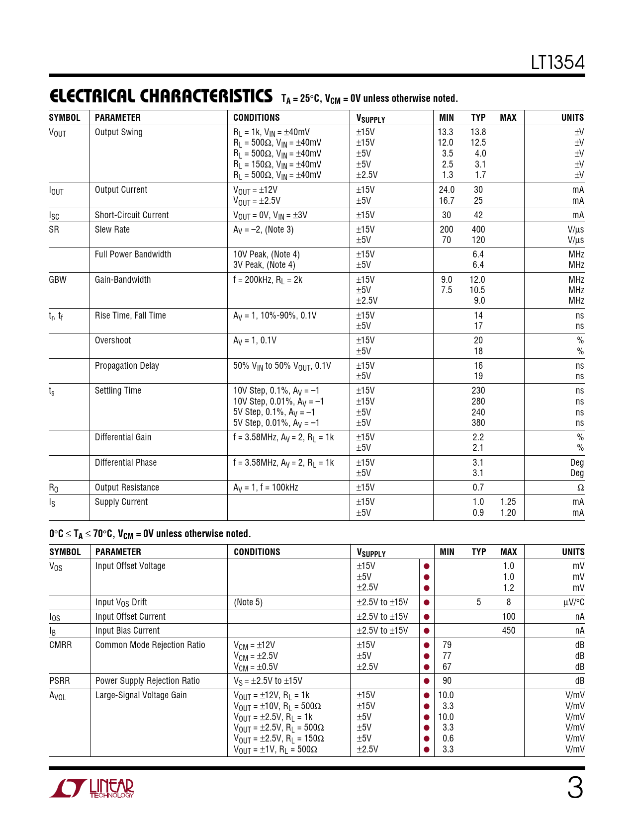 VOUT Output Swing RL = 1k, VIN = ±40mV ±15V 13.3 13.8 ±V RL = 500Ω, VIN = ±40mV ±15V 12.0 12.5 ±V RL = 500Ω, VIN = ±40mV ±5V 3.5 4.0 ±V RL = 150Ω, VIN = ±40mV ±5V 2.5 3.1 ±V RL = 500Ω, VIN = ±40mV ±2.5V 1.3 1.7 ±V IOUT Output Current VOUT = ±12V ±15V 24.0 30 mA VOUT = ±2.5V ±5V 16.7 25 mA ISC Short-Circuit Current VOUT = 0V, VIN = ±3V ±15V 30 42 mA SR Slew Rate AV = –2, (Note 3) ±15V 200 400 V/µs ±5V 70 120 V/µs Full Power Bandwidth 10V Peak, (Note 4) ±15V 6.4 MHz 3V Peak, (Note 4) ±5V 6.4 MHz GBW Gain-Bandwidth f = 200kHz, RL = 2k ±15V 9.0 12.0 MHz ±5V 7.5 10.5 MHz ±2.5V 9.0 MHz tr, tf Rise Time, Fall Time AV = 1, 10%-90%, 0.1V ±15V 14 ns ±5V 17 ns Overshoot AV = 1, 0.1V ±15V 20 % ±5V 18 % Propagation Delay 50% VIN to 50% VOUT, 0.1V ±15V 16 ns ±5V 19 ns ts Settling Time 10V Step, 0.1%, AV = –1 ±15V 230 ns 10V Step, 0.01%, AV = –1 ±15V 280 ns 5V Step, 0.1%, AV = –1 ±5V 240 ns 5V Step, 0.01%, AV = –1 ±5V 380 ns Differential Gain f = 3.58MHz, AV = 2, RL = 1k ±15V 2.2 % ±5V 2.1 % Differential Phase f = 3.58MHz, AV = 2, RL = 1k ±15V 3.1 Deg ±5V 3.1 Deg RO Output Resistance AV = 1, f = 100kHz ±15V 0.7 Ω IS Supply Current ±15V 1.0 1.25 mA ±5V 0.9 1.20 mA