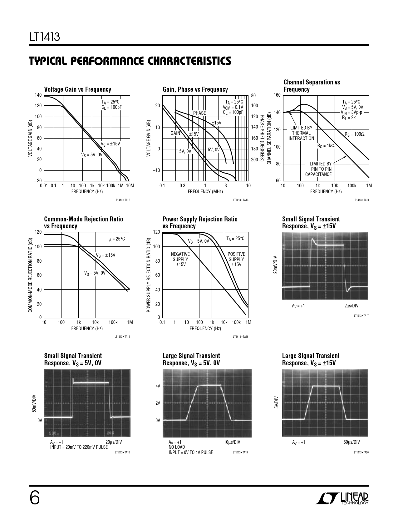 4V 2V 5V/DIV 50mV/DIV 0V 0V A 20µs/DIV A 10 V = +1 µs/DIV A V = +1 V = +1 50µs/DIV INPUT = 20mV TO 220mV PULSE NO LOAD LT1413 • TA18 INPUT = 0V TO 4V PULSE LT1413 • TA19 LT1413 • TA20 6