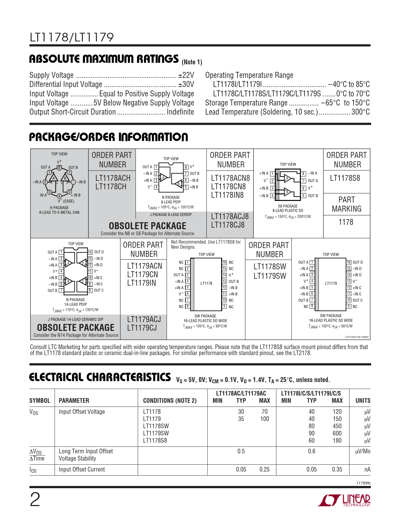 VOS Input Offset Voltage LT1178 30 70 40 120 µV LT1179 35 100 40 150 µV LT1178SW 80 450 µV LT1179SW 90 600 µV LT1178S8 60 180 µV ∆VOS Long Term Input Offset 0.5 0.6 µV/Mo ∆Time Voltage Stability IOS Input Offset Current 0.05 0.25 0.05 0.35 nA 11789fb 2