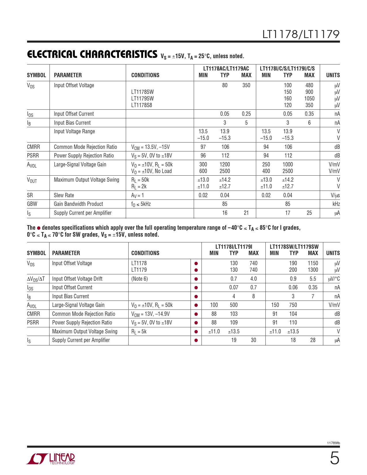 ELECTRICAL CHARACTERISTICS VS =. 15V, TA = 25. C, unless noted. LT1178AC/LT1179AC LT1178I/C/S/LT1179I/C/S. SYMBOL. PARAMETER