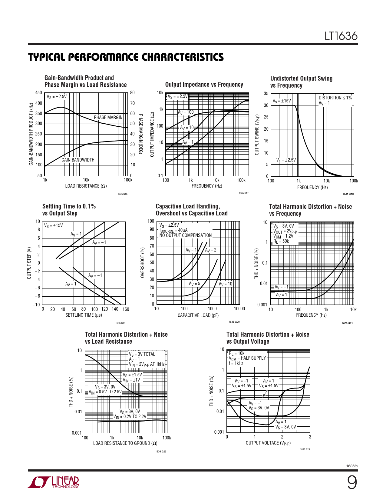 LT1636 WUTYPICAL PERFOR A CE CHARACTERISTICSGain-Bandwidth Product andUndistorted Output SwingPhase Margin vs Load ResistanceOutput Impedance vs Frequencyvs Frequency 450 80 10k 35 VS = ±2.5V VS = ±2.5V DISTORTION ≤ 1% V 400 70 s = ±15V A 30 V = 1 1k PHASE MARGIN (DEG) 350 60 ) AV = 100 ) Ω PHASE MARGIN 25 P-P 300 50 100 AV = 10 20 250 40 15 A 200 30 10 V = 1 150 20 OUTPUT SWING (V 10 OUTPUT IMPEDANCE ( GAIN BANDWIDTH 1 Vs = ±2.5V GAIN-BANDWIDTH PRODUCT (kHz) 100 10 5 50 0 0.1 0 1k 10k 100k 100 1k 10k 100k 100 1k 10k 100k LOAD RESISTANCE (Ω) FREQUENCY (Hz) FREQUENCY (Hz) 1636 G16 1635 G17 1635 G18 Settling Time to 0.1%Capacitive Load Handling,Total Harmonic Distortion + Noisevs Output StepOvershoot vs Capacitive Loadvs Frequency 10 100 10 V V S = ±15V S = ±2.5V VS = 3V, 0V 8 90 ISOURCE = 40µA V A OUT = 2VP-P V = 1 NO OUTPUT COMPENSATION 6 80 VCM = 1.2V A R V = – 1 1 L = 50k 4 70 AV = 1 AV = 2 2 60 0 50 0.1 – 2 40 AV = –1 OVERSHOOT (%) OUTPUT STEP (V) – 4 30 THD + NOISE (%) A A V = 1 V = 5 AV = 10 0.01 – 6 20 AV = –1 – 8 10 AV = 1 –10 0 0.001 0 20 40 60 80 100 120 140 160 10 100 1000 10000 10 100 1k 10k SETTLING TIME (µs) CAPACITIVE LOAD (pF) FREQUENCY (Hz) 1636 G20 1636 G19 1636 G21 Total Harmonic Distortion + NoiseTotal Harmonic Distortion + Noisevs Load Resistancevs Output Voltage 10 10 V R S = 3V TOTAL L = 10k A V V = 1 CM = HALF SUPPLY V f = 1kHz IN = 2VP-P AT 1kHz 1 1 VS = ±1.5V VIN = ±1V AV = –1 AV = 1 V V V S = 3V, 0V S = ±1.5V S = ±1.5V 0.1 V 0.1 IN = 0.5V TO 2.5V A THD + NOISE (%) THD + NOISE (%) V = –1 VS = 3V, 0V 0.01 VS = 3V, 0V 0.01 VIN = 0.2V TO 2.2V AV = 1 VS = 3V, 0V 0.001 0.001 100 1k 10k 100k 0 1 2 3 LOAD RESISTANCE TO GROUND (Ω) OUTPUT VOLTAGE (VP-P) 1636 G23 1636 G22 1636fc 9
