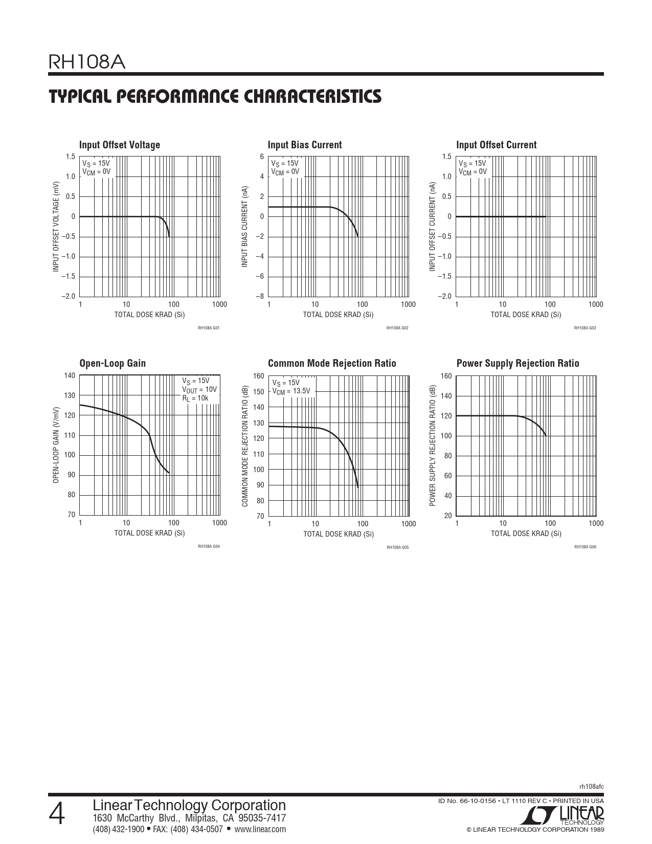140 160 160 VS = 15V VS = 15V VOUT = 10V V 130 150 CM = 13.5V R 140 L = 10k 140 120 120 130 110 120 100 100 110 80 100 90 60 OPEN-LOOP GAIN (V/mV) 90 80 40 80 COMMON MODE REJECTION RATIO (dB) POWER SUPPLY REJECTION RATIO (dB) 70 70 20 1 10 100 1000 1 10 100 1000 1 10 100 1000 TOTAL DOSE KRAD (Si) TOTAL DOSE KRAD (Si) TOTAL DOSE KRAD (Si) RH108A G04 RH108A G05 RH108A G06 rh108afc 4 Linear Technology Corporation ID No. 66-10-0156 • LT 1110 REV C • PRINTED IN USA 1630 McCarthy Blvd., Milpitas, CA 95035-7417 (408) 432-1900 ● FAX: (408) 434-0507 ● www.linear.com © LINEAR TECHNOLOGY CORPORATION 1989