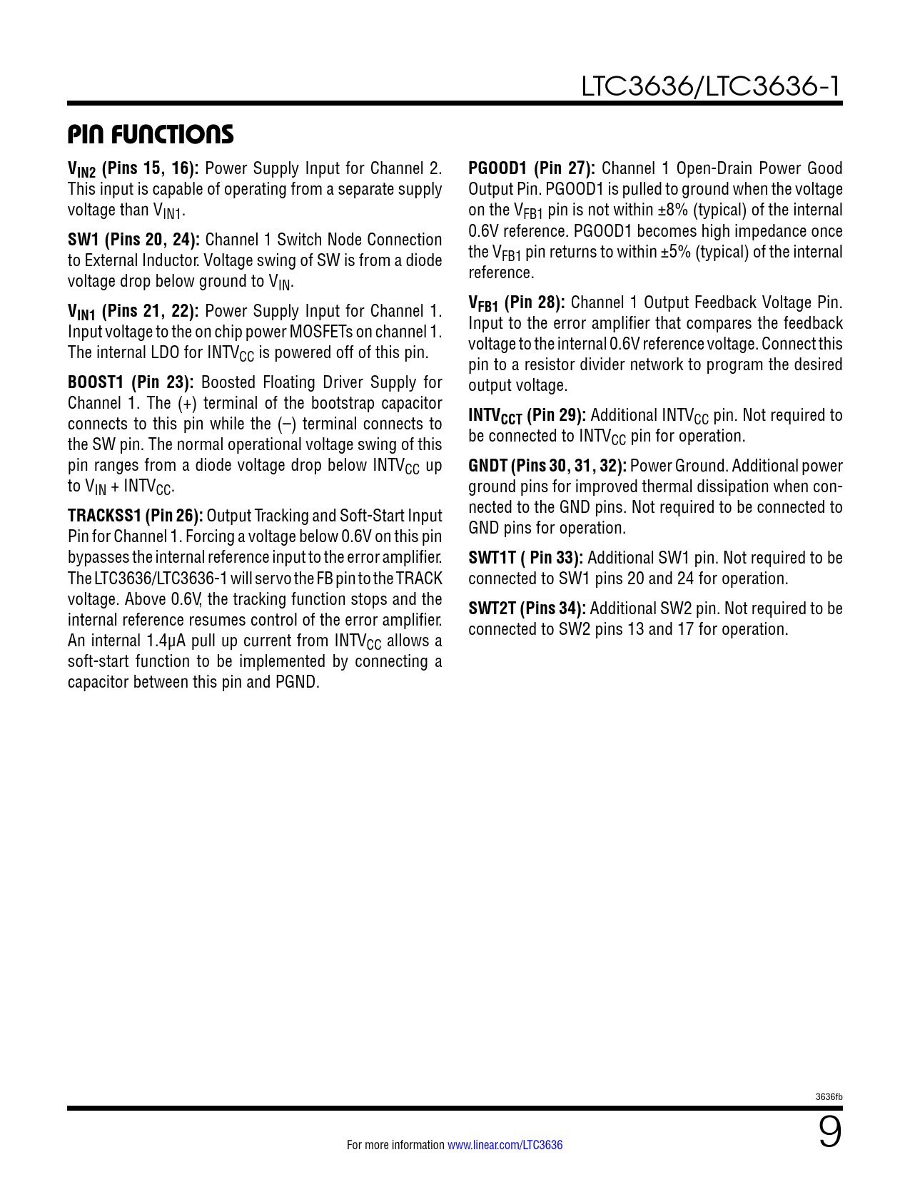Additional SW1 pin. Not required to be The LTC3636/LTC3636-1 will servo the FB pin to the TRACK connected to SW1 pins 20 and 24 for operation. voltage. Above 0.6V, the tracking function stops and the