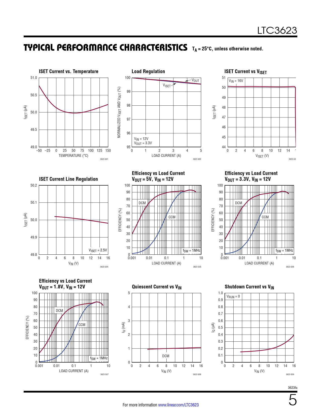 50.2 100 100 90 90 80 80 50.1 DCM DCM 70 70 60 60 (µA) CCM CCM 50.0 50 50 I ISET 40 40 EFFICIENCY (%) EFFICIENCY (%) 30 30 49.9 20 20 10 10 VISET = 2.5V fSW = 1MHz fSW = 1MHz 49.8 0 0 0 2 4 6 8 10 12 14 16 0.001 0.01 0.1 1 10 0.001 0.01 0.1 1 10 VIN (V) LOAD CURRENT (A) LOAD CURRENT (A) 3623 G04 3623 G05 3623 G06