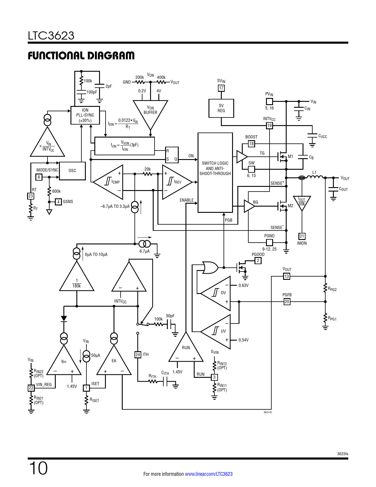 VON 200k 400k 100k GND V SV OUT IN 2pF 17 100pF 0.2V 4V PVIN VIN V 5V ON 5, 16 CIN ION BUFFER REG PLL-SYNC INTV (±30%) 0.0122• V CC I IN ION = R 19 T C BOOST VCC V V ! IN VON 18 t (1pF) INTV ON = I CC ION R TG ON M1 CB S Q SWITCH LOGIC SW MODE/SYNC OSC 20k AND ANTI- + + L1 SHOOT-THROUGH 6, 15 8 VOUT ICMP IREV SENSE+ – – C RT OUT 600k 23 I 4 GSNS ENABLE BG OUT –6.7µA TO 3.3µA M2 50k RT PGB SENSE– PGND 21 IMON 6.7µA 9-12, 25 0µA TO 10µA PGOOD 2 VOUT 13 1 – 180k 0.63V – + RPG2 OV PGFB + INTVCC 20 50pF 100k RPG1 – UV + VIN 0.54V RUN SVIN 50µA 24 ITH V – + IN gm EA RIN12 (OPT) RIN22 – + + – CITH 1.45V (OPT) R RUN ITH 3 VIN_REG ISET 1.45V R 22 1 IN11 (OPT) RIN21 RISET (OPT) 3623 FD 3623fa 10 For more information www.linear.com/LTC3623