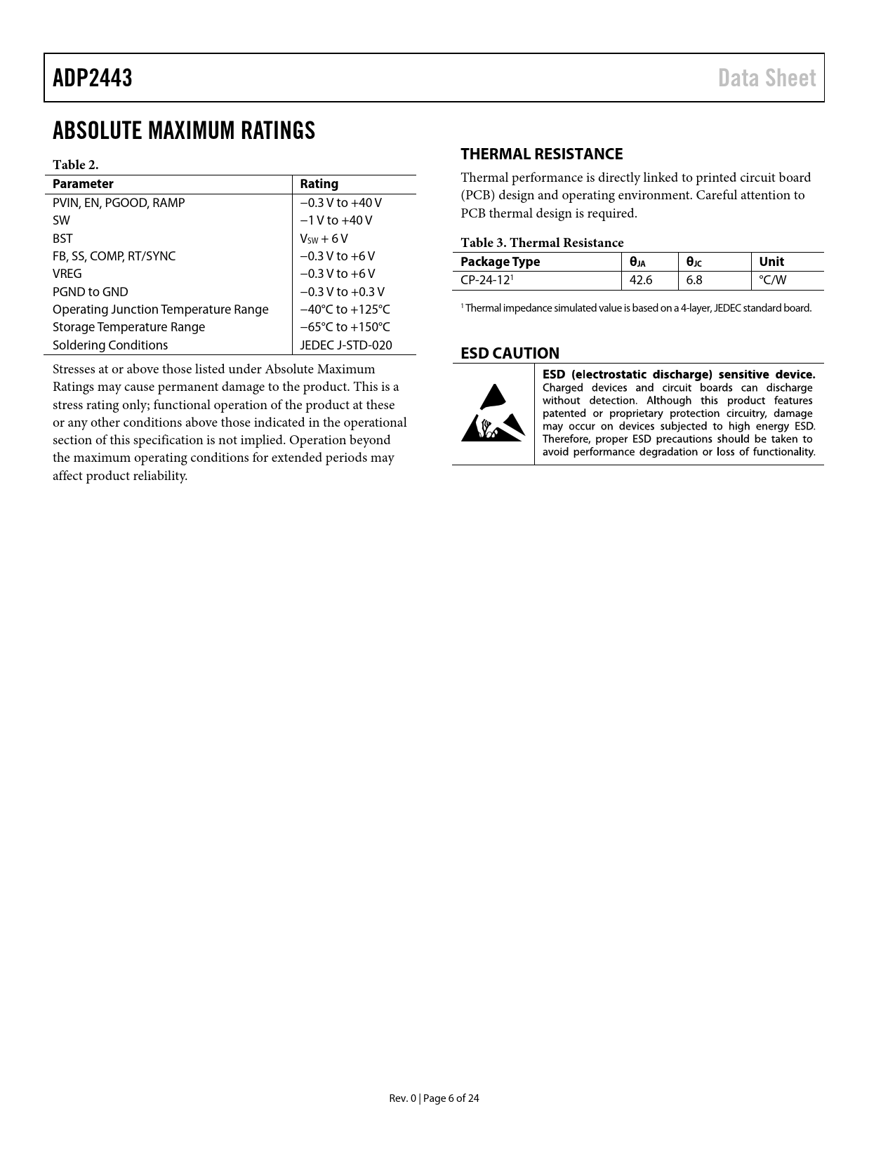 Páginas / Página24 / 6 — ADP2443. Data Sheet. ABSOLUTE MAXIMUM RATINGS. THERMAL RESISTANCE. Table …