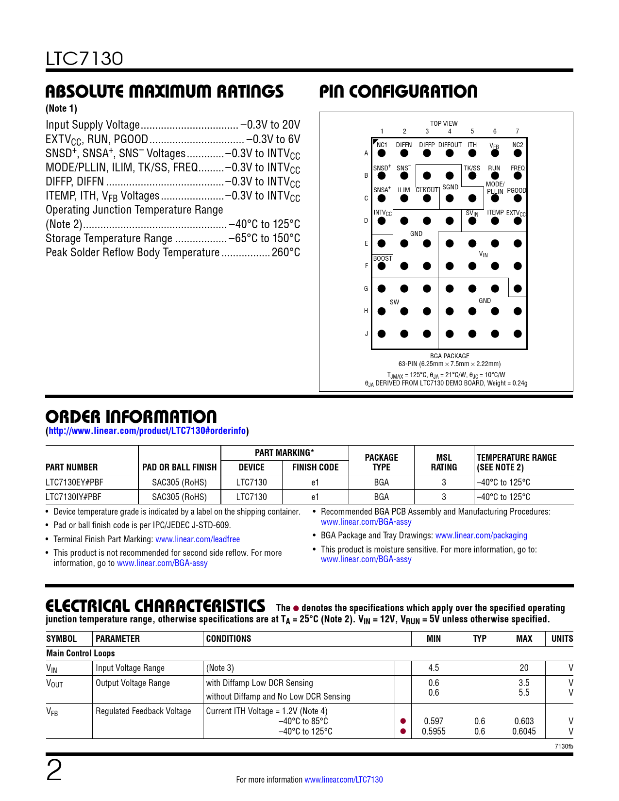 LTC7130 ABSOLUTE MAXIMUM RATINGSPIN CONFIGURATION(Note 1) Input Supply Voltage .. –0.3V to 20V TOP VIEW EXTV 1 2 3 4 5 6 7 CC, RUN, PGOOD ... –0.3V to 6V NC1 DIFFN DIFFP DIFFOUT ITH V NC2 SNSD+, SNSA+, SNS– Voltages ...–0.3V to INTV FB CC A MODE/PLLIN, ILIM, TK/SS, FREQ ...–0.3V to INTVCC SNSD+ SNS– TK/SS RUN FREQ DIFFP, DIFFN ...–0.3V to INTV B CC SGND MODE/ ITEMP, ITH, V SNSA+ ILIM CLKOUT PLLIN PGOOD FB Voltages .. –0.3V to INTVCC C Operating Junction Temperature Range INTVCC SV ITEMP IN EXTVCC (Note 2) .. –40°C to 125°C D Storage Temperature Range .. –65°C to 150°C GND E Peak Solder Reflow Body Temperature ...260°C VIN BOOST F G SW GND H J BGA PACKAGE 63-PIN (6.25mm × 7.5mm × 2.22mm) TJMAX = 125°C, θJA = 21°C/W, θJC = 10°C/W θJA DERIVED FROM LTC7130 DEMO BOARD, Weight = 0.24g ORDER INFORMATION(http://www.linear.com/product/LTC7130#orderinfo)PART MARKING*PACKAGEMSLTEMPERATURE RANGEPART NUMBERPAD OR BALL FINISHDEVICEFINISH CODETYPERATING(SEE NOTE 2) LTC7130EY#PBF SAC305 (RoHS) LTC7130 e1 BGA 3 –40°C to 125°C LTC7130IY#PBF SAC305 (RoHS) LTC7130 e1 BGA 3 –40°C to 125°C • Device temperature grade is indicated by a label on the shipping container. • Recommended BGA PCB Assembly and Manufacturing Procedures: • Pad or ball finish code is per IPC/JEDEC J-STD-609. www.linear.com/BGA-assy • Terminal Finish Part Marking: www.linear.com/leadfree • BGA Package and Tray Drawings: www.linear.com/packaging • This product is not recommended for second side reflow. For more • This product is moisture sensitive. For more information, go to: information, go to www.linear.com/BGA-assy www.linear.com/BGA-assy ELECTRICALCHARACTERISTICS The l denotes the specifications which apply over the specified operatingjunction temperature range, otherwise specifications are at TA = 25°C (Note 2). VIN = 12V, VRUN = 5V unless otherwise specified.SYMBOLPARAMETERCONDITIONSMINTYPMAXUNITSMain Control Loops VIN Input Voltage Range (Note 3) 4.5 20 V VOUT Output Voltage Range with Diffamp Low DCR Sensing 0.6 3.5 V without Diffamp and No Low DCR Sensing 0.6 5.5 V VFB Regulated Feedback Voltage Current ITH Voltage = 1.2V (Note 4) –40°C to 85°C l 0.597 0.6 0.603 V –40°C to 125°C l 0.5955 0.6 0.6045 V 7130fb 2 For more information www.linear.com/LTC7130 Document Outline Features Applications Description Typical Application Absolute Maximum Ratings Pin Configuration Electrical Characteristics Pin Functions Functional Block Diagram Operation Applications Information Typical Application Related Parts .34579 Applications Typical Application Description Absolute Maximum Ratings Order Information Electrical Characteristics Pin Configuration Pin Functions Functional Block Diagram Operation Applications Information Typical Applications Typical Application Related Parts