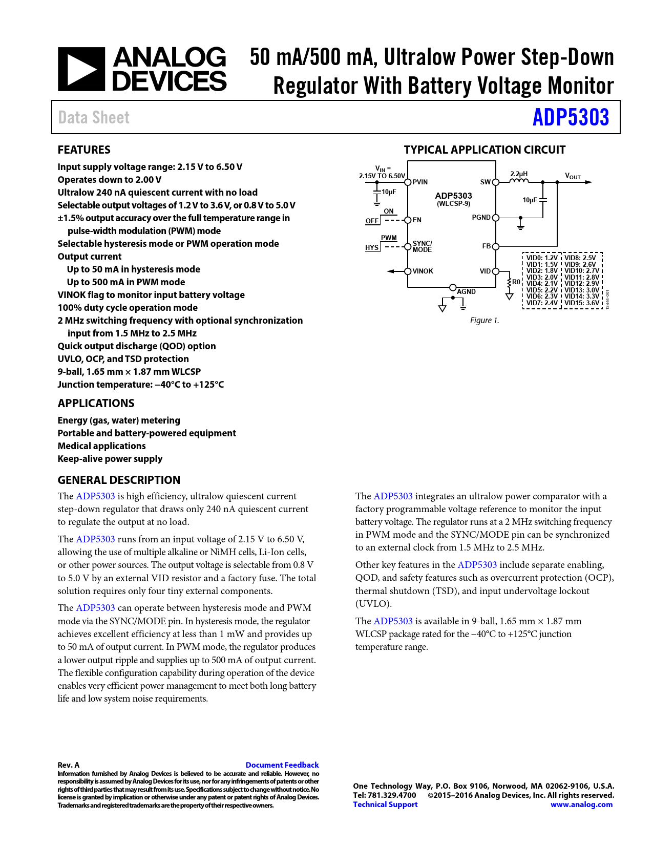The ADP5303 is high efficiency, ultralow quiescent current The ADP5303 integrates an ultralow power comparator with a step-down regulator that draws only 240 nA quiescent current factory programmable voltage reference to monitor the input to regulate the output at no load. battery voltage. The regulator runs at a 2 MHz switching frequency The ADP5303 runs from an input voltage of 2.15 V to 6.50 V, in PWM mode and the SYNC/MODE pin can be synchronized allowing the use of multiple alkaline or NiMH cells, Li-Ion cells, to an external clock from 1.5 MHz to 2.5 MHz. or other power sources. The output voltage is selectable from 0.8 V Other key features in the ADP5303 include separate enabling, to 5.0 V by an external VID resistor and a factory fuse. The total QOD, and safety features such as overcurrent protection (OCP), solution requires only four tiny external components. thermal shutdown (TSD), and input undervoltage lockout The ADP5303 can operate between hysteresis mode and PWM (UVLO). mode via the SYNC/MODE pin. In hysteresis mode, the regulator The ADP5303 is available in 9-ball, 1.65 mm × 1.87 mm achieves excellent efficiency at less than 1 mW and provides up WLCSP package rated for the −40°C to +125°C junction to 50 mA of output current. In PWM mode, the regulator produces temperature range. a lower output ripple and supplies up to 500 mA of output current. The flexible configuration capability during operation of the device enables very efficient power management to meet both long battery life and low system noise requirements.