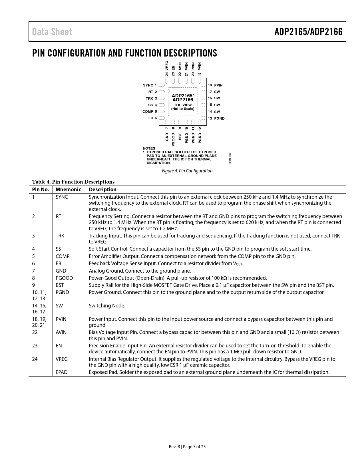 Data Sheet. ADP2165/ADP2166. PIN CONFIGURATION AND FUNCTION DESCRIPTIONS. PVI. SYNC 1. 18 PVIN. RT 2. 17 SW. ADP2165/. TRK 3. 16 SW. ADP2166