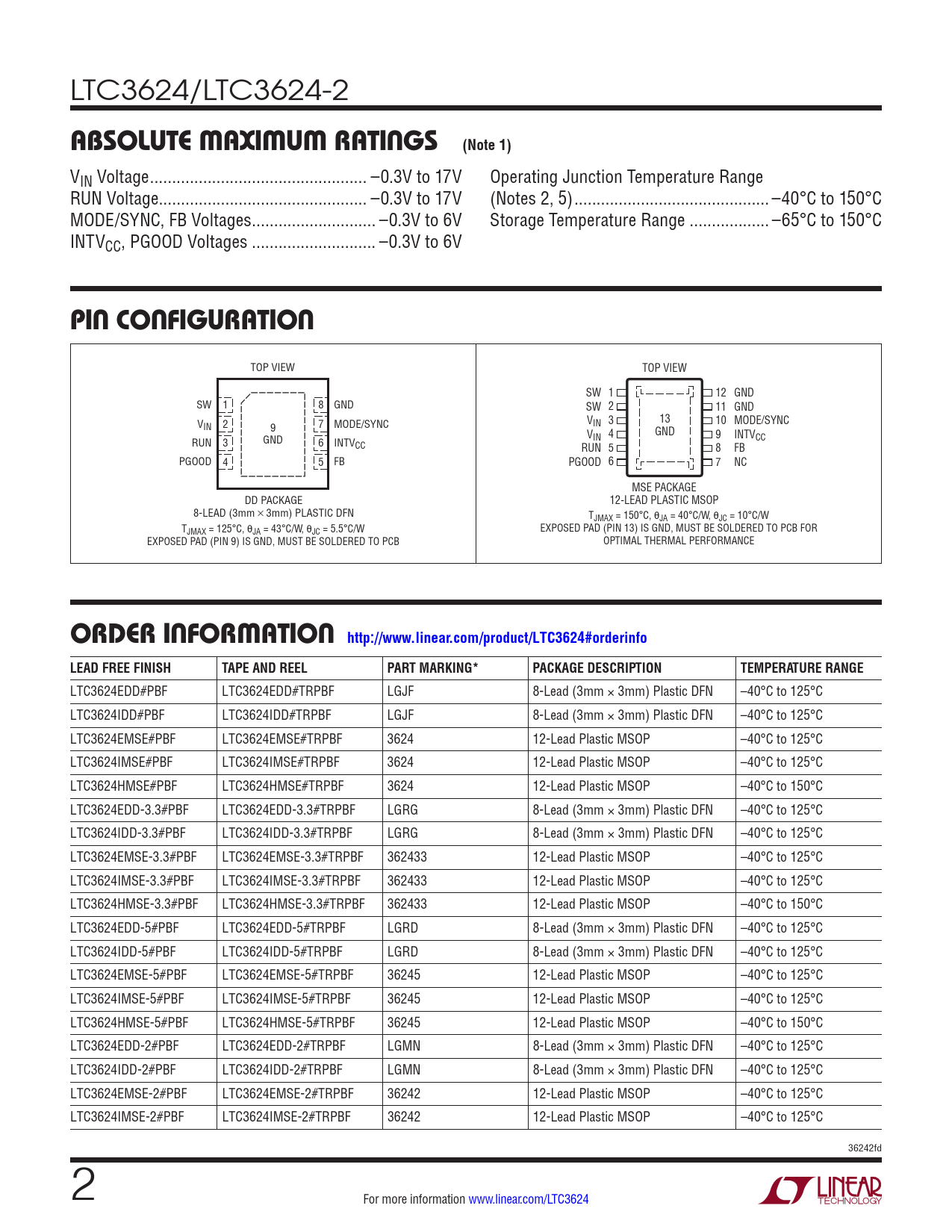 absoluTe MaxiMuM raTings (Note 1). pin conFiguraTion. orDer inForMaTion http://www.linear.com/product/LTC3624#orderinfo