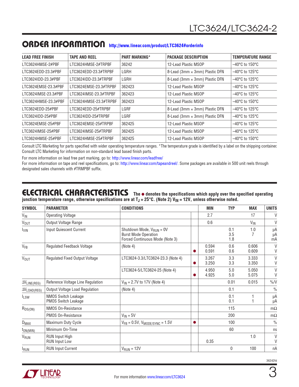 LTC3624HMSE-2#PBF LTC3624HMSE-2#TRPBF 36242 12-Lead Plastic MSOP –40°C to 150°C LTC3624EDD-23.3#PBF LTC3624EDD-23.3#TRPBF LGRH 8-Lead (3mm × 3mm) Plastic DFN –40°C to 125°C LTC3624IDD-23.3#PBF LTC3624IDD-23.3#TRPBF LGRH 8-Lead (3mm × 3mm) Plastic DFN –40°C to 125°C LTC3624EMSE-23.3#PBF LTC3624EMSE-23.3#TRPBF 362423 12-Lead Plastic MSOP –40°C to 125°C LTC3624IMSE-23.3#PBF LTC3624IMSE-23.3#TRPBF 362423 12-Lead Plastic MSOP –40°C to 125°C LTC3624HMSE-23.3#PBF LTC3624HMSE-23.3#TRPBF 362423 12-Lead Plastic MSOP –40°C to 150°C LTC3624EDD-25#PBF LTC3624EDD-25#TRPBF LGRF 8-Lead (3mm × 3mm) Plastic DFN –40°C to 125°C LTC3624IDD-25#PBF LTC3624IDD-25#TRPBF LGRF 8-Lead (3mm × 3mm) Plastic DFN –40°C to 125°C LTC3624EMSE-25#PBF LTC3624EMSE-25#TRPBF 362425 12-Lead Plastic MSOP –40°C to 125°C LTC3624IMSE-25#PBF LTC3624IMSE-25#TRPBF 362425 12-Lead Plastic MSOP –40°C to 125°C LTC3624HMSE-25#PBF LTC3624HMSE-25#TRPBF 362425 12-Lead Plastic MSOP –40°C to 150°C Consult LTC Marketing for parts specified with wider operating temperature ranges. *The temperature grade is identified by a label on the shipping container. Consult LTC Marketing for information on non-standard lead based finish parts. For more information on lead free part marking, go to: http://www.linear.com/leadfree/ For more information on tape and reel specifications, go to: http://www.linear.com/tapeandreel/. Some packages are available in 500 unit reels through designated sales channels with #TRMPBF suffix.
