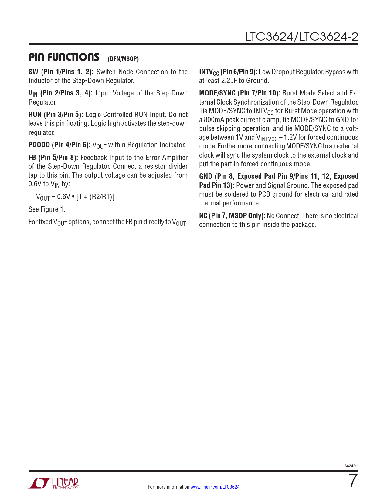 LTC3624/LTC3624-2 pin FuncTions (DFN/MSOP) SW (Pin 1/Pins 1, 2): Switch Node Connection to the INTVCC (Pin 6/Pin 9): Low Dropout Regulator. Bypass with Inductor of the Step-Down Regulator. at least 2.2µF to Ground. VIN (Pin 2/Pins 3, 4): Input Voltage of the Step-Down MODE/SYNC (Pin 7/Pin 10): Burst Mode Select and Ex- Regulator. ternal Clock Synchronization of the Step-Down Regulator. RUN (Pin 3/Pin 5): Logic Controlled RUN Input. Do not Tie MODE/SYNC to INTVCC for Burst Mode operation with leave this pin floating. Logic high activates the step-down a 800mA peak current clamp, tie MODE/SYNC to GND for regulator. pulse skipping operation, and tie MODE/SYNC to a volt- age between 1V and VINTVCC – 1.2V for forced continuous PGOOD (Pin 4/Pin 6): VOUT within Regulation Indicator. mode. Furthermore, connecting MODE/SYNC to an external FB (Pin 5/Pin 8): Feedback Input to the Error Amplifier clock will sync the system clock to the external clock and of the Step-Down Regulator. Connect a resistor divider put the part in forced continuous mode. tap to this pin. The output voltage can be adjusted from GND (Pin 8, Exposed Pad Pin 9/Pins 11, 12, Exposed 0.6V to VIN by: Pad Pin 13): Power and Signal Ground. The exposed pad V must be soldered to PCB ground for electrical and rated OUT = 0.6V • [1 + (R2/R1)] thermal performance. See Figure 1. NC (Pin 7, MSOP Only): No Connect. There is no electrical For fixed VOUT options, connect the FB pin directly to VOUT. connection to this pin inside the package. 36242fd For more information www.linear.com/LTC3624 7 Document Outline Features Applications Typical Application Description Absolute Maximum Ratings Pin Configuration Order Information Order Information Electrical Characteristics Typical Performance Characteristics Pin Functions Block Diagram Operation Applications Information Package Description Revision History Typical Application Related Parts
