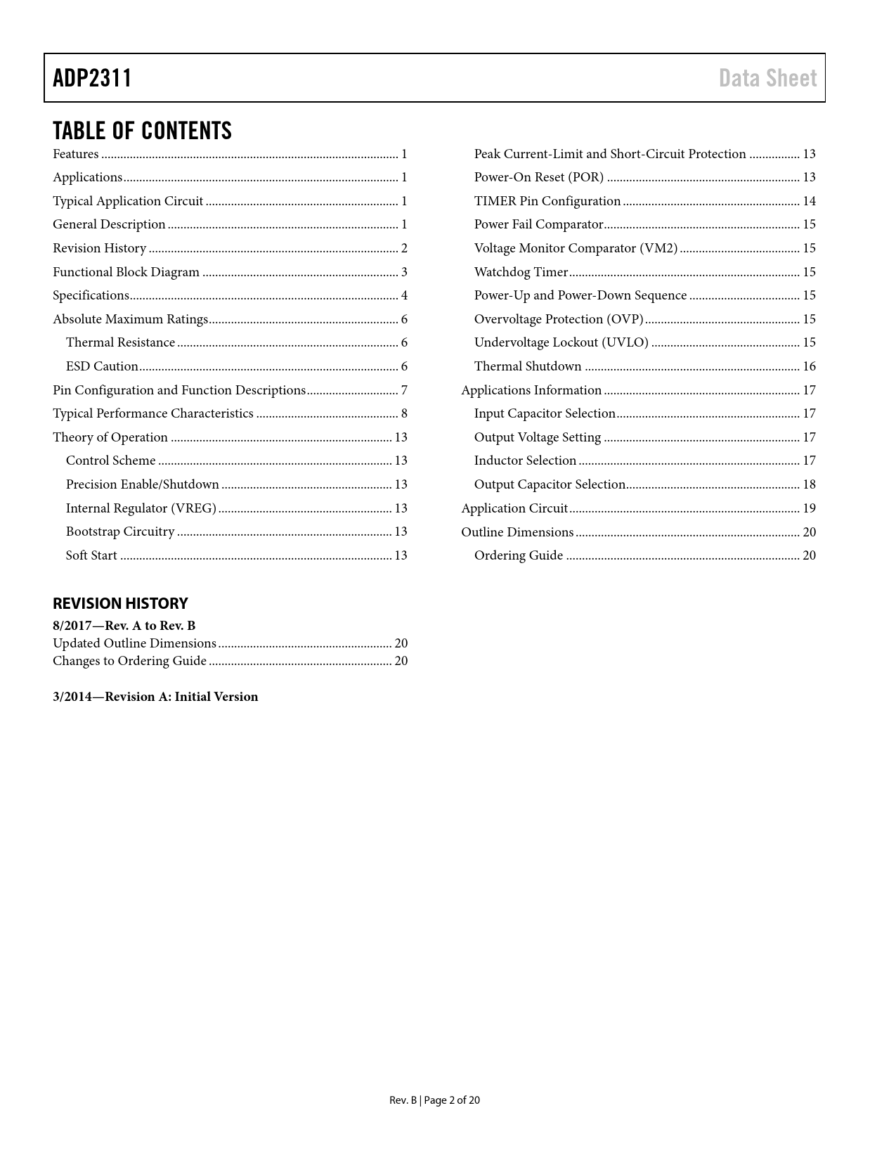 Páginas / Página20 / 2 — ADP2311. Data Sheet. TABLE OF CONTENTS. REVISION HISTORY 8/2017—Rev. A to …