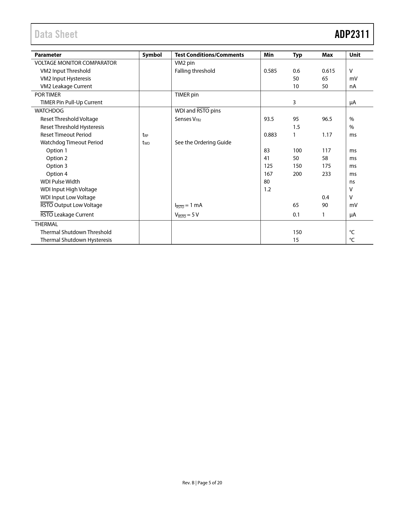 | Páginas / Página | 20 / 5 — Data Sheet. ADP2311. Parameter. Symbol. Test Conditions/Comments. Min. … |