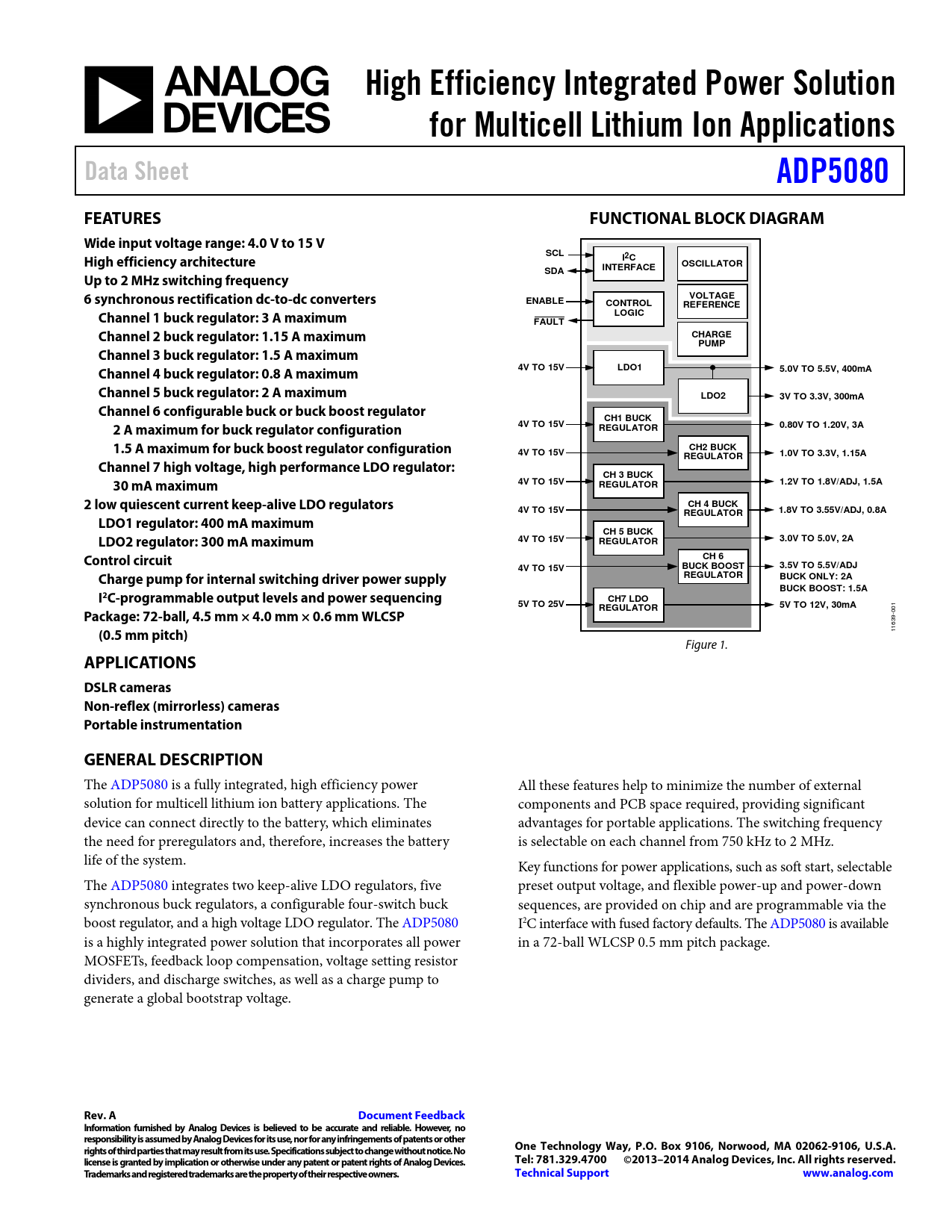 High Efficiency Integrated Power Solution. for Multicell Lithium Ion Applications. Data Sheet. ADP5080. FEATURES