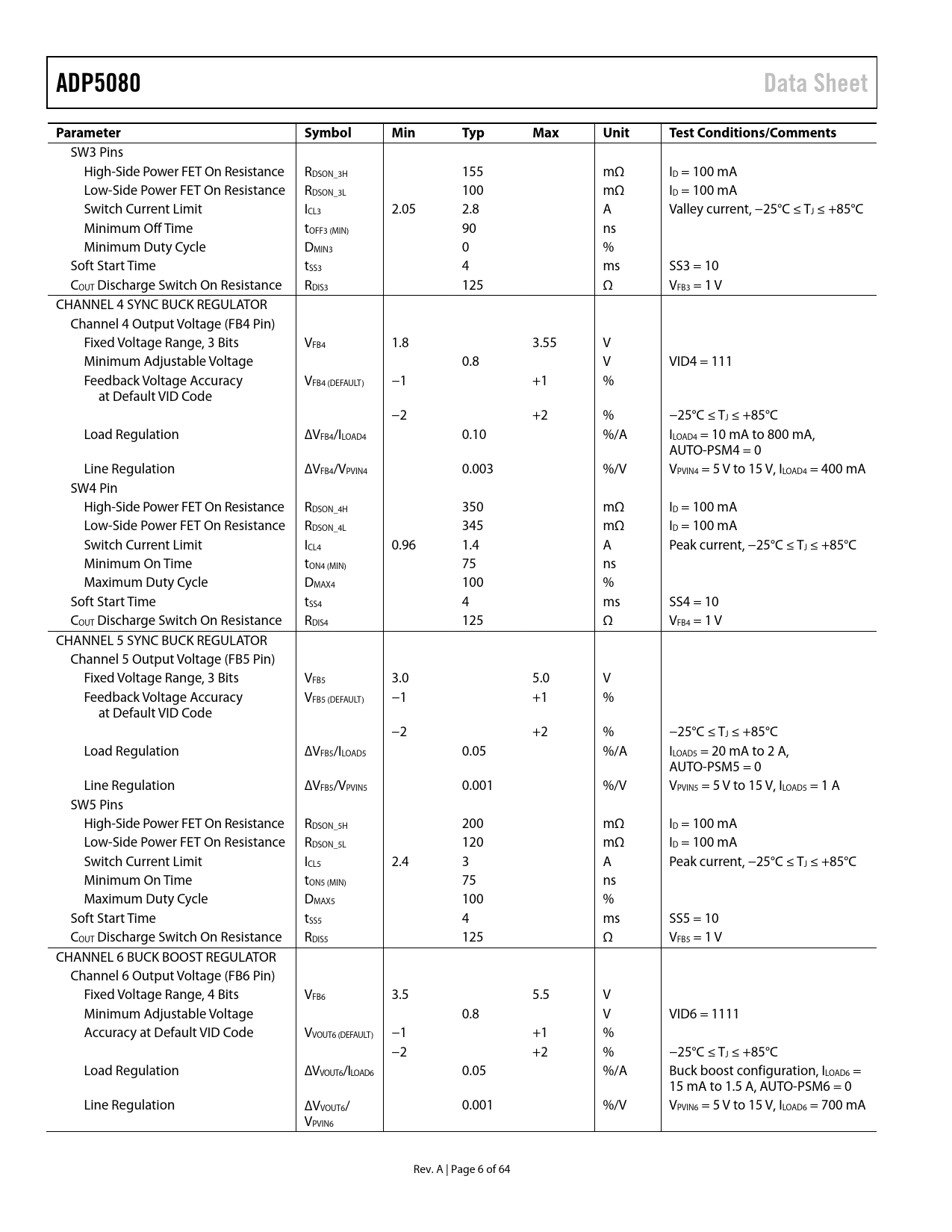 | Páginas / Página | 64 / 6 — ADP5080. Data Sheet. Parameter. Symbol. Min. Typ. Max. Unit. Test … |